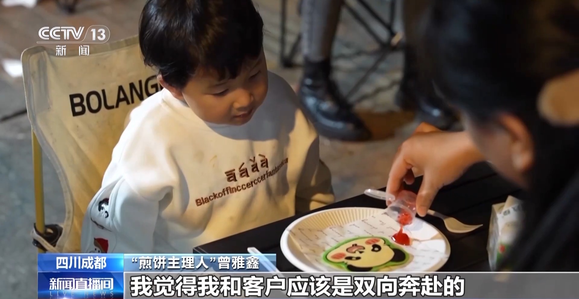 “煎饼主理人” 曾雅鑫:我做完煎饼,好累,腰好痛,但一翻煎饼他们就,哇!我就又可以了,感觉又充电了。最开始的时候,我是为了生活,现在我是为了让更多的消费者喜欢我的饼。他们开心,我就会开心,我和客户应该是双向奔赴的。