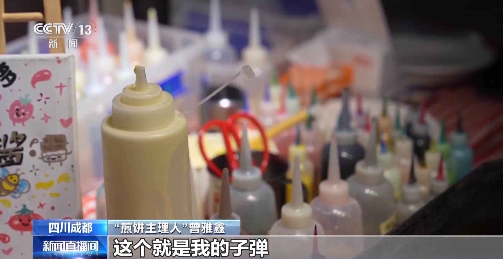 曾雅鑫告诉记者,自己是学美术专业的。偶然的机会看到成都夜市人气火爆,也想着来这里做点生意。几经思考,她决定结合自己的专业特长,开辟卡通图案煎饼这条“新赛道”,赋予传统小吃全新的形态和艺术价值。没想到,这样的创意赢得了不少消费者的喜爱。随着曾雅鑫制作卡通煎饼的短视频在网络上走红,更是有全国各地的游客慕名而来,她也被网友们称为“煎饼主理人”。