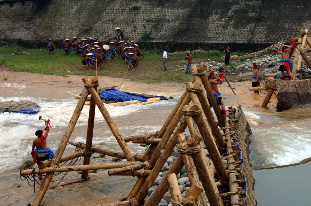 2006年4月5日,都江堰清明放水节上,“河工”拉开拦河的杩槎开始放水。当日,四川省都江堰市举行清明放水节,以纪念蜀郡太守李冰修筑都江堰。已经有2000多年历史的都江堰水利工程至今依然浇灌着川西1000多万亩良田。新华社记者陈燮摄