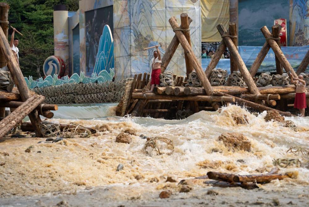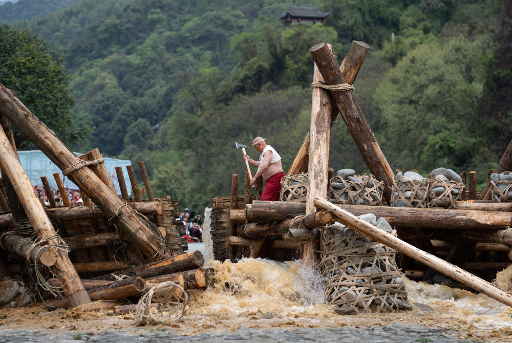 4月4日,在2025都江堰放水节上,堰工砍断杩槎的绳索后,岷江水奔流而下。新华社记者 江宏景 摄