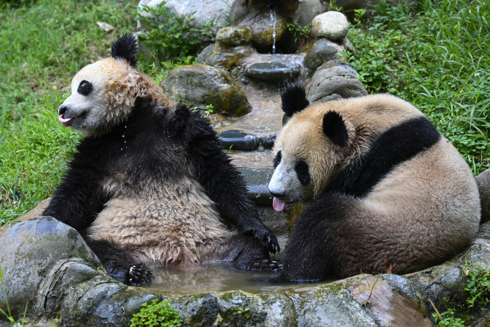 2022年8月18日,中国大熊猫保护研究中心都江堰基地的大熊猫在圈舍的水池里戏水玩耍。新华社记者 沈伯韩 摄