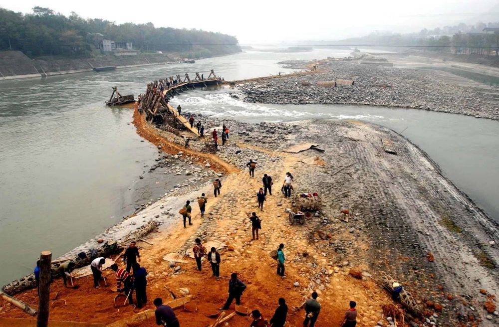 这是一场与时间赛跑的盛大劳作:人们将粗壮原木扎成三角“杩槎”,连排置于江中,再压上装满卵石的竹笼,覆以竹笆、黏土,便在江心筑起一道临时堤坝,将江水引开。随后是最关键的清淤,工匠们跃入刺骨的江水,挥锄挖掘河床,直到触到深埋的“卧铁”方止。“卧铁”是深淘的尺度,是千年经验的物化。而飞沙堰的修复高度,也严格遵循着卧铁之上两米的祖制——过高则沙石难排,过低则宝瓶口引水不足。