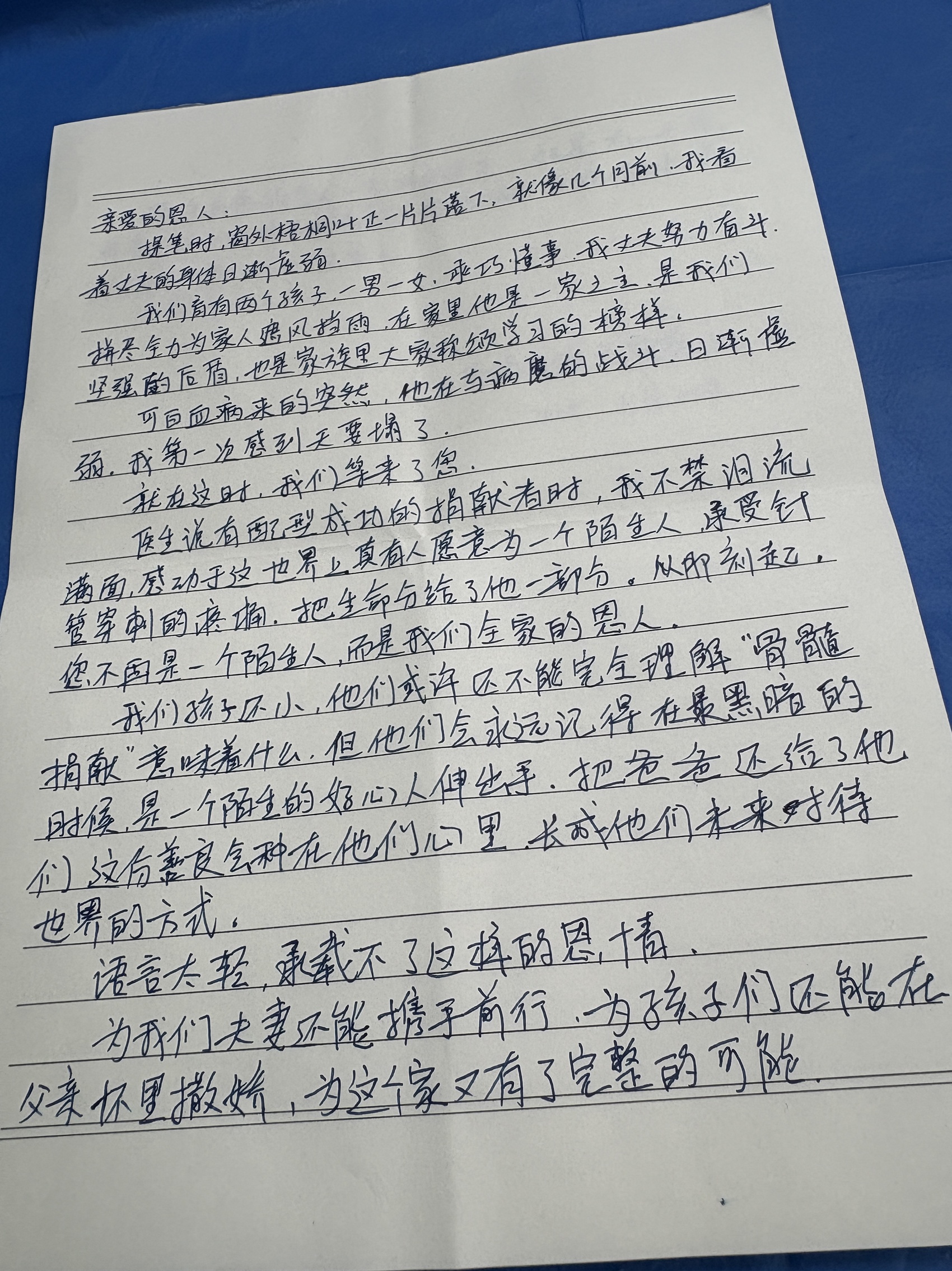 信中说,孩子们还小,可能不完全理解“骨髓捐献”意味着什么,“但他们会永远记得,在最黑暗的时候,是一个陌生的好心人伸出手把爸爸还给了他们。”