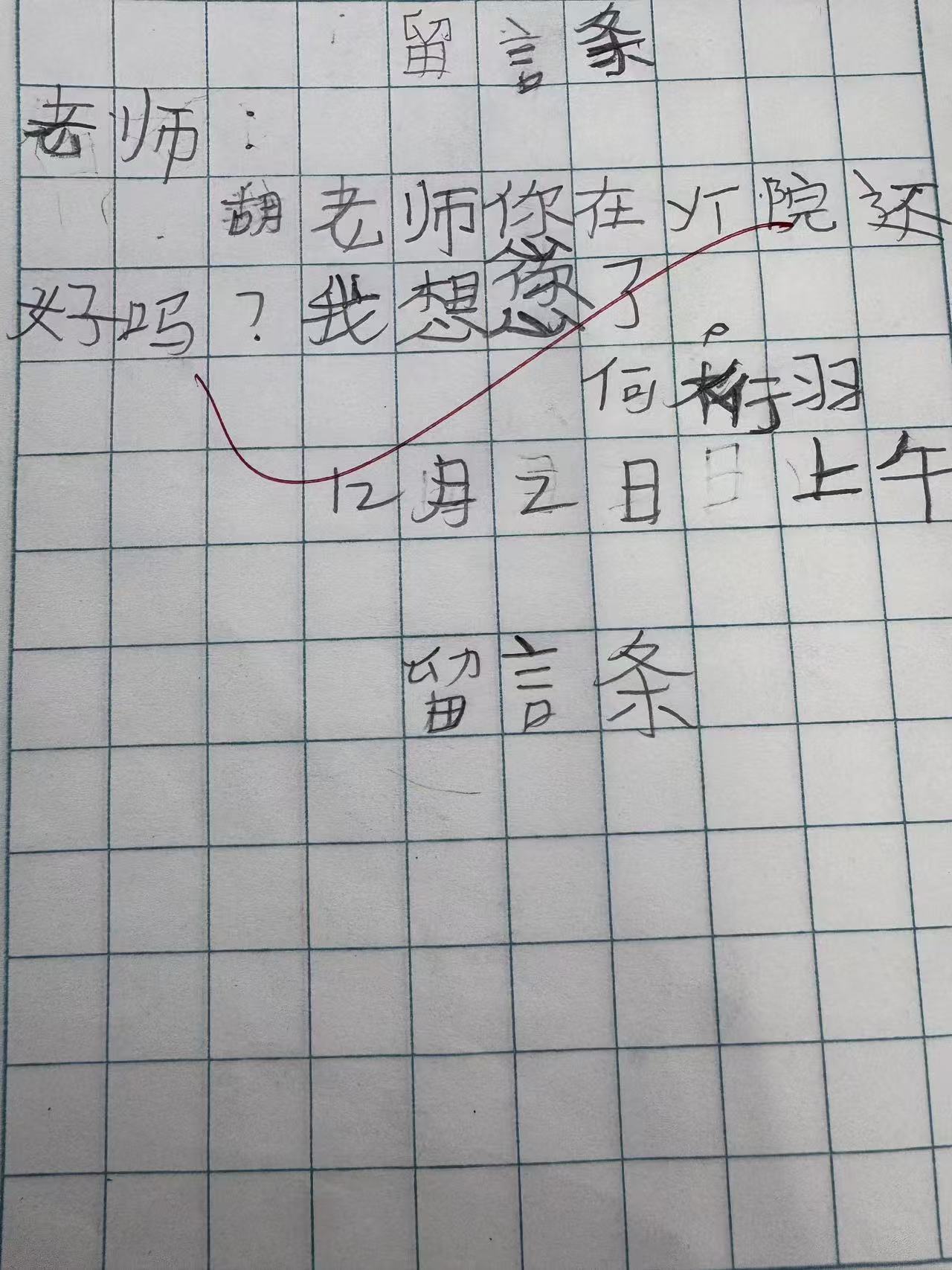 回到学校后,她的办公桌上出现了歪歪扭扭的纸条:“我想您了。”