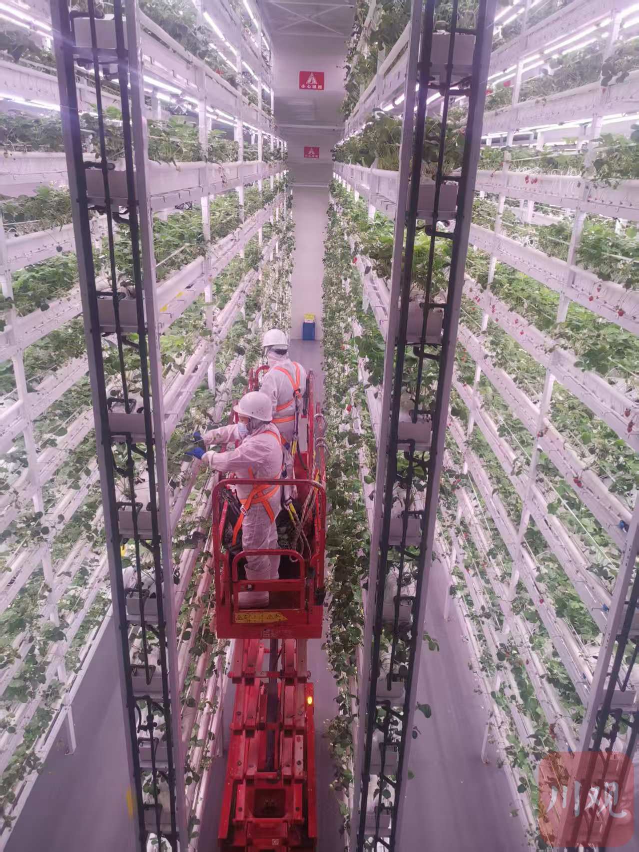 实验室里的“盆景”,正加快转化为市场上的“风景”。今年6月,西南最大的规模化立体草莓智慧工厂在成都市温江区投用。该草莓工厂5个生长舱总占地2000平方米,经特殊的光照、温度、营养等定制“配方”,365天均可采摘高品质草莓,日均产能可达200公斤,年产量超过73吨。该项目技术已在上海、湖北等国内多个省市推广应用。