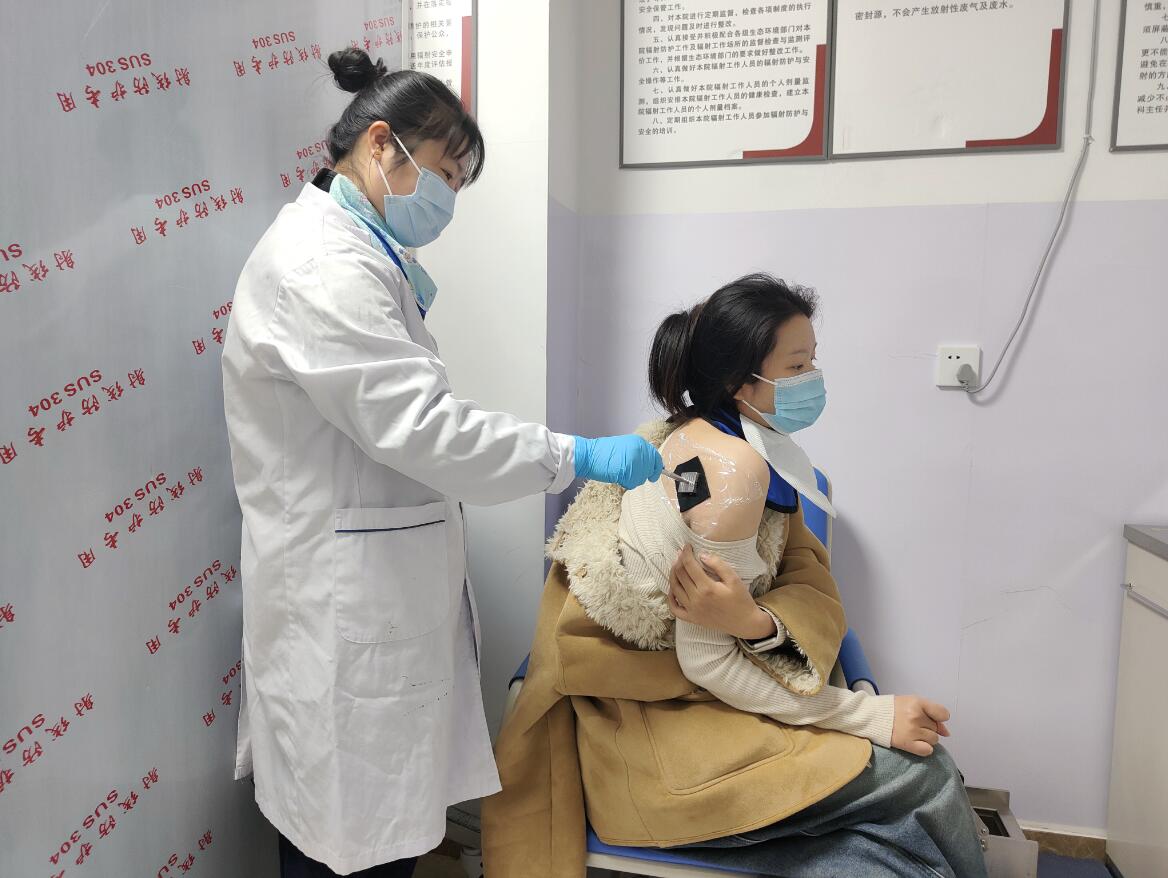 早上8点过,夹江县人民医院核医学科主任宋丹萍已经忙碌了起来,在她手中,一枚小小的“印章”贴合于患者的皮肤,正在开展放射性核素敷贴治疗。