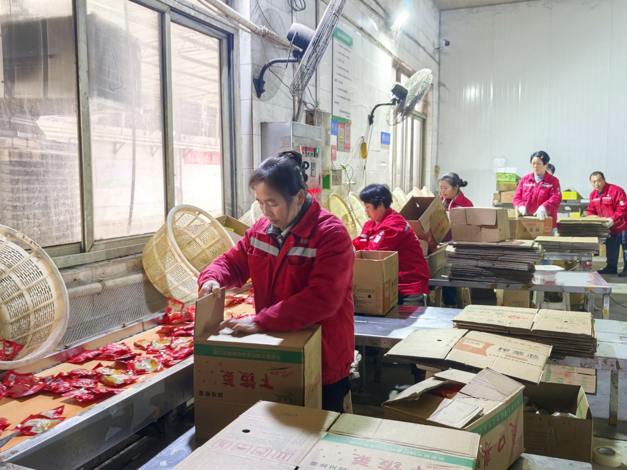 乐至县大靖轩食品有限公司的自动化流水线,工人正在打包。