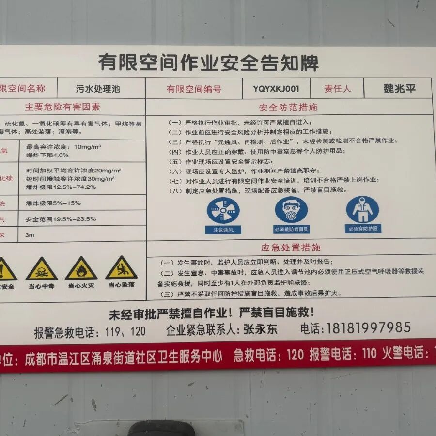 危险分析:污水处理站有限空间告知牌破损,会导致进入该区域的工作人员、外来巡检或维护人员无法清晰获取完整的风险提示信息,可能因不知情而未采取必要防护措施,进而造成严重后果。