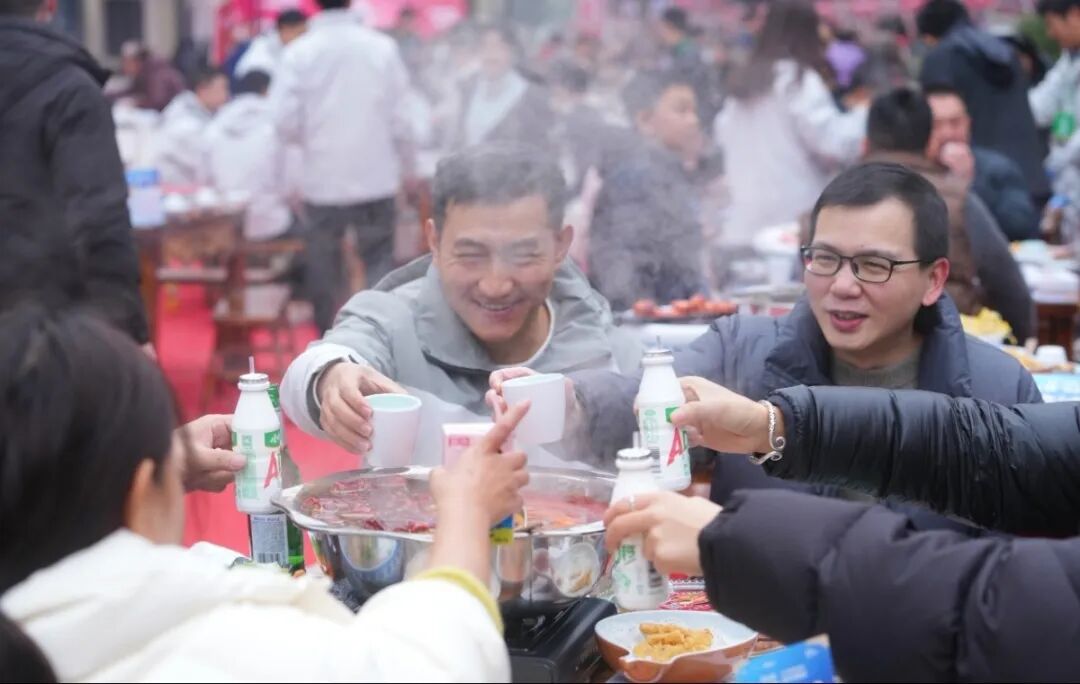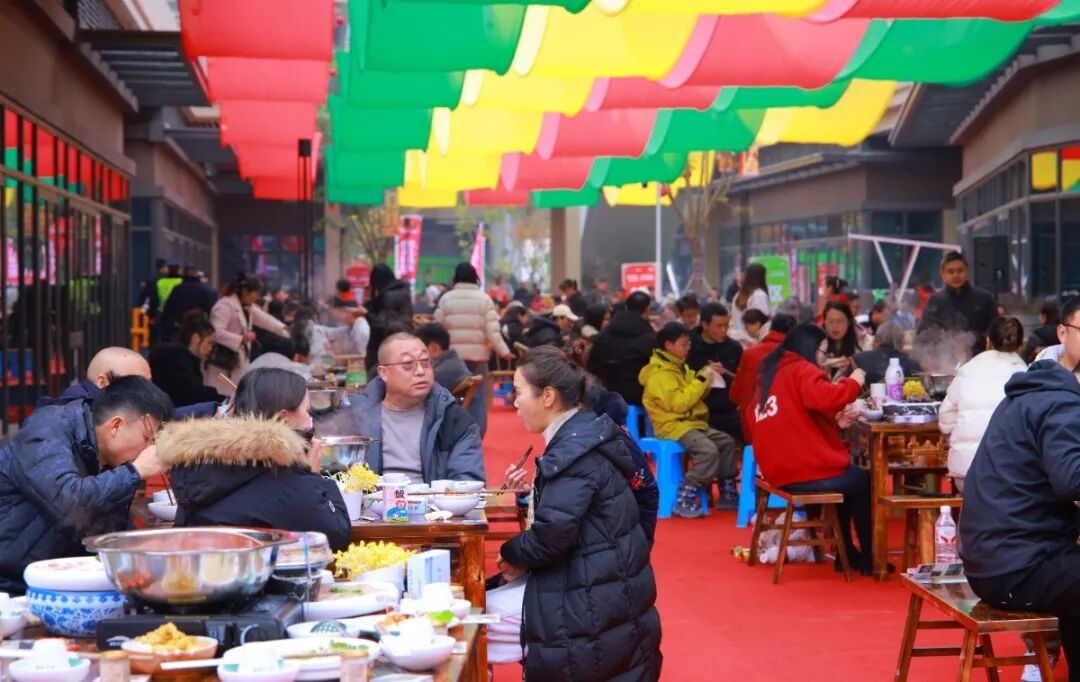 120张餐桌依次排开,市民们围坐在热气腾腾的火锅边,笑语喧腾间,锅底红浪翻滚,香气漫溢。人们涮着鲜嫩的牛羊肉,捞起爽脆的蔬菜,在蒸腾的烟火里举杯畅谈,交织出一幅暖意融融的欢聚图景。