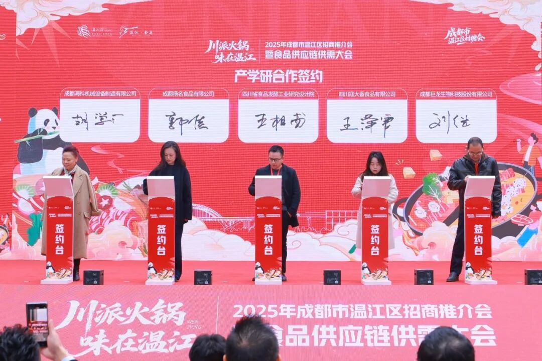 作为温江村糖会赋能产业发展的务实举措,在火锅派对开席前,现场举行了“川派火锅·味在温江”2025年成都市温江区招商推介会暨食品供应链供需大会,吸引了50余家火锅产业链上下游企业、30余家餐饮采购商及高校院所代表齐聚,共话火锅产业链聚合、创新成果转化、品牌IP赋能。