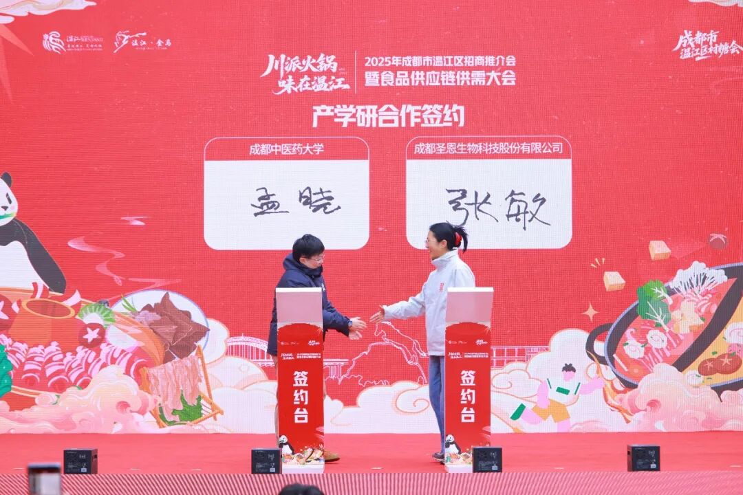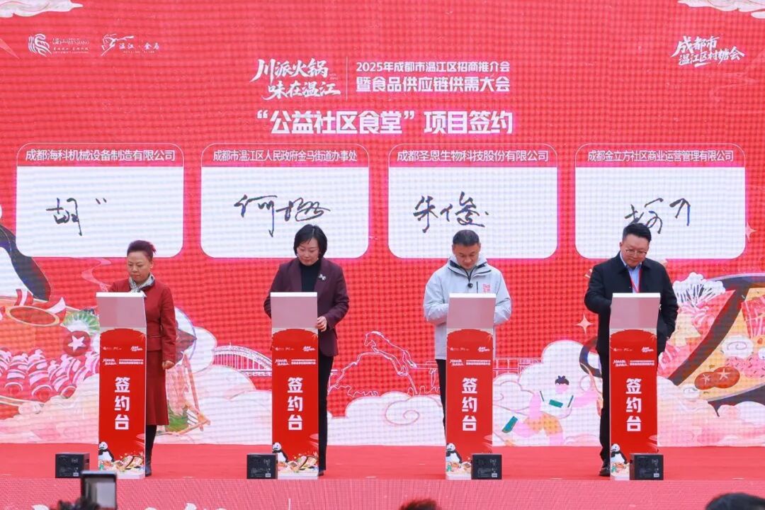 在本次活动的签约环节,产学研合作、供应链合作、“公益社区食堂”项目三大签约环节依次推进:成都中医药大学与圣恩股份签约推进养生汤料产品开发,四川省食品发酵工业研究设计院有限公司与四家企业签署技术合作协议;圣恩股份携手供应链企业及餐饮商家达成供应链合作;金马街道与相关企业完成“公益社区食堂”项目签约,全方位助力温江火锅产业创新发展与民生服务提升。