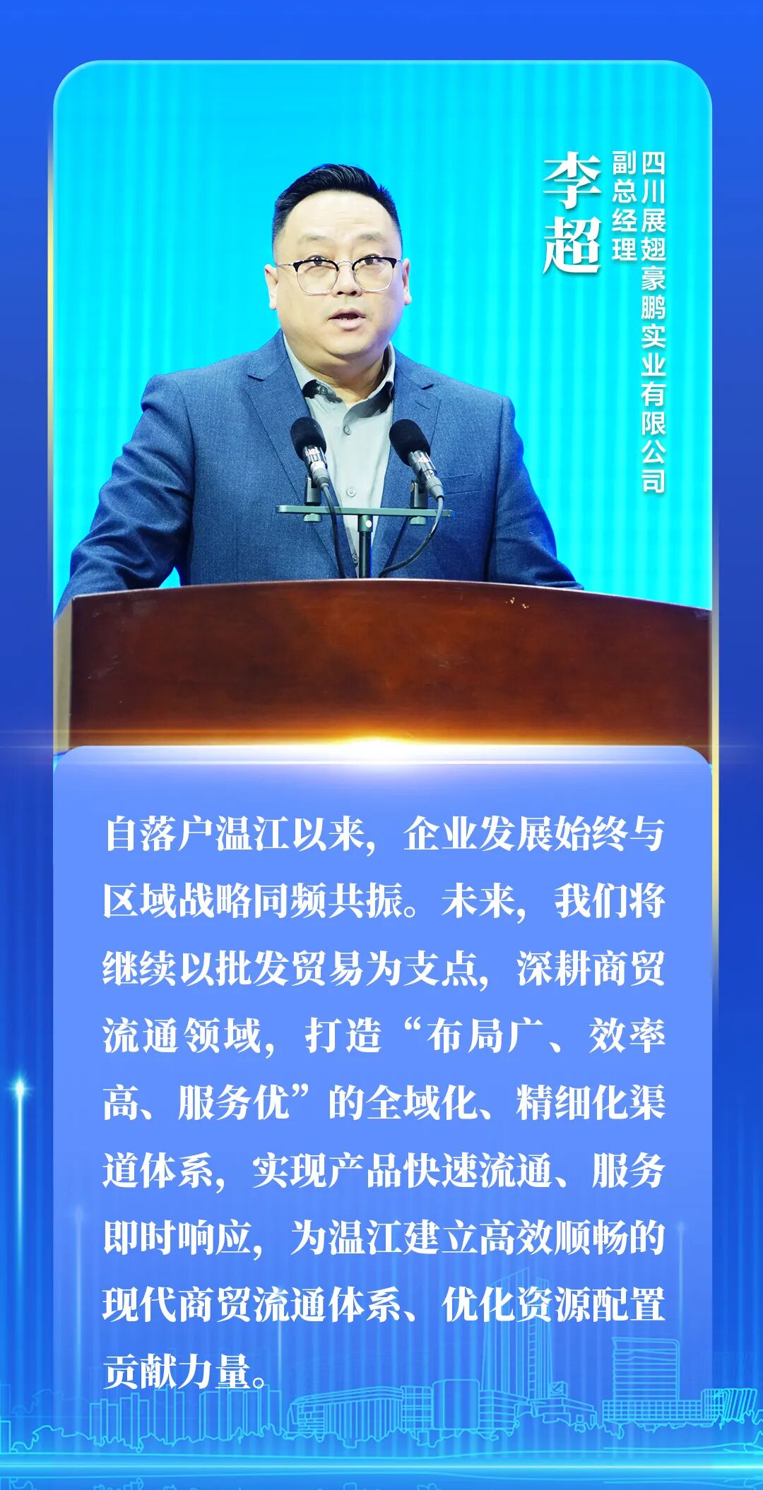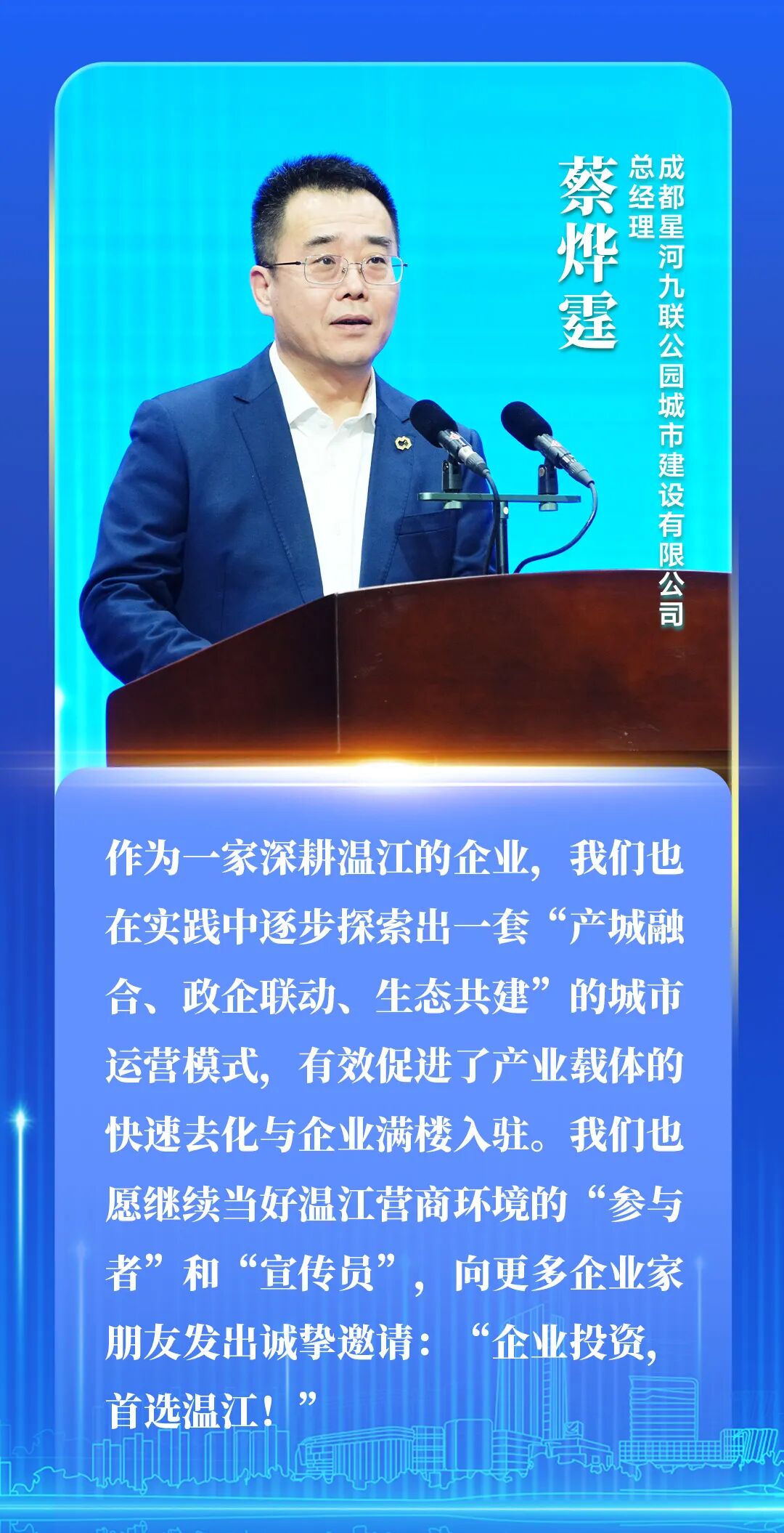 携手未来,我们努力把岁月铺成红毯,前行风景美不胜收。希望大家永葆“闯”的精神,做创新突围的领跑者,坚定科技自立自强的志气,攻坚核心技术、掌握竞争主动,让更多“温江创造”闪耀时代舞台。厚植“家”的情怀,做城市发展的主人翁,广泛参与到温江“吃住行游购娱”的每一个细微处,共同提升城市活力、幸福温度,把温江建设成为人生的启航地和梦想的实现地。讲好“金”的故事,做温江生活的代言人,融入“温江一家亲”,立足自身实际,展示城市魅力、推介城市机会、助力城市营销,把“金温江”的历史文脉、发展点滴、温情故事讲述好、传播好、弘扬好。扛牢“责”的担当,做守信重诺的实干家,大力发扬企业家精神,坚定经营操守,履行社会责任,彰显价值担当,打造更多基业长青、活力永续的“百年老店”。