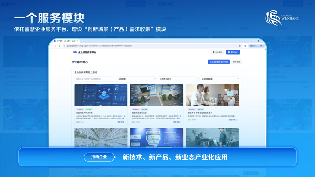 “一个服务模块”是指依托智慧企业服务平台,增设“场景创新服务”模块,政务端上传场景需求、企业端上传产品(服务)供给,通过后台智能匹配、专员跟踪服务,推动企业新技术、新产品、新业态产业化应用。