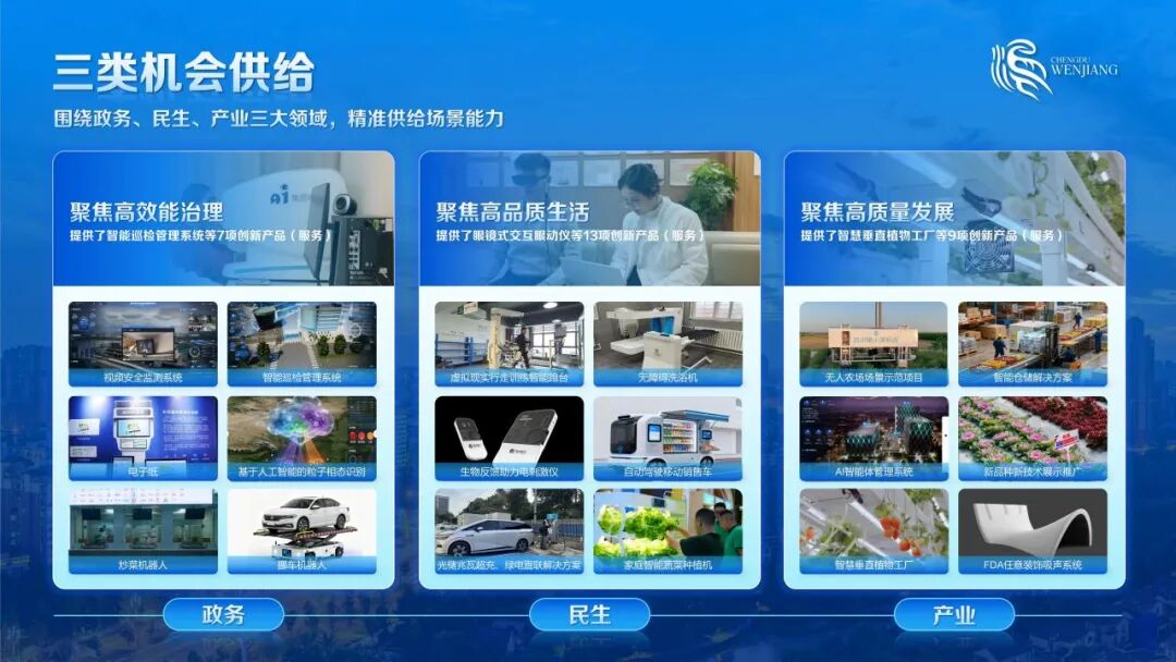 三类机会供给清单围绕政务、民生、产业三大领域,精准供给了29项场景,涉及数字经济、装备制造、信息通信、医药健康、银发经济等前沿方向。聚焦高效能治理,提供了智能巡检管理系统等7项创新产品(服务);聚焦高品质生活,提供了眼镜式交互眼动仪等13项创新产品(服务);聚焦高质量发展,提供了智慧垂直植物工厂等9项创新产品(服务)。
