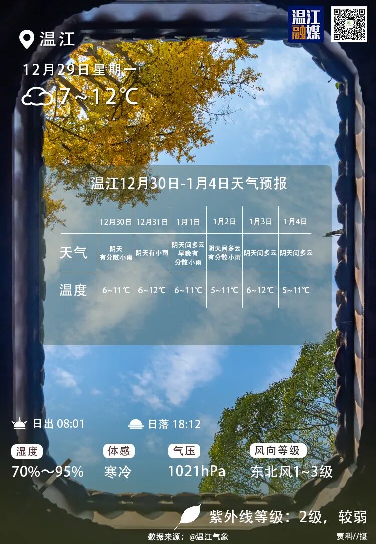 12月30日(周二)阴天,有分散小雨,气温6~11℃;