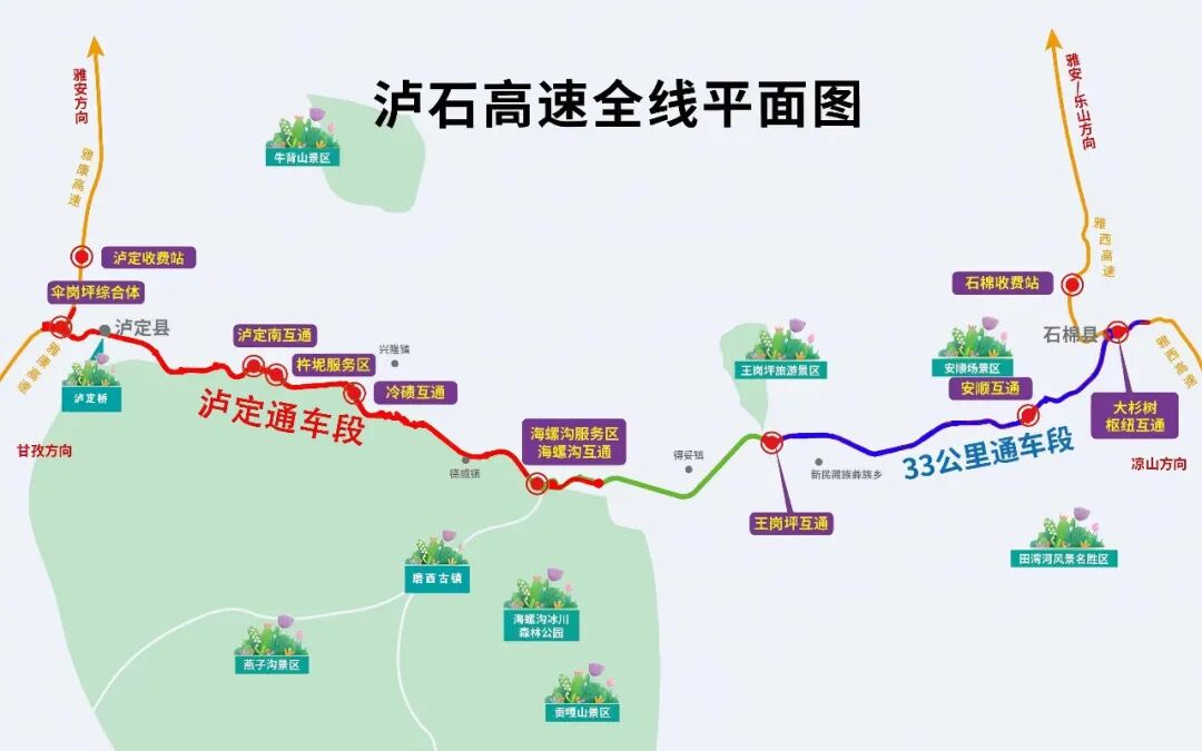 本次通车的泸石高速泸定段,起于甘孜州泸定县伞岗坪互通,接驳雅康高速,途经泸定南、冷碛,一路穿山越岭,止于海螺沟互通;路段内共设桥梁34座、隧道8座、互通式立交4处,泸定南、冷碛、海螺沟3处收费站同步开通,配套服务区(停车区)将后续投用。