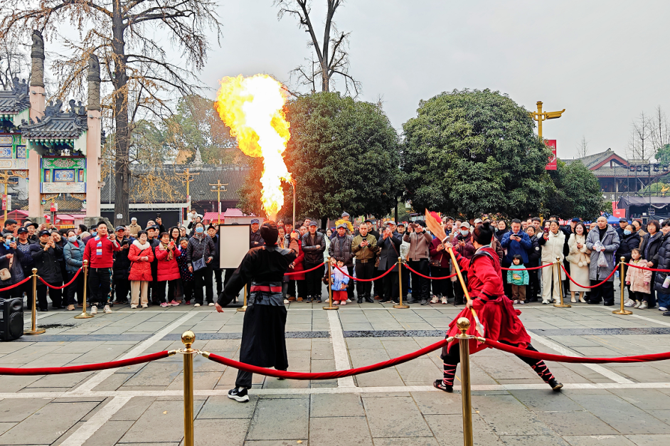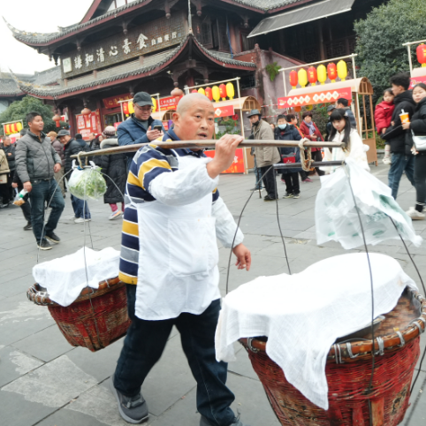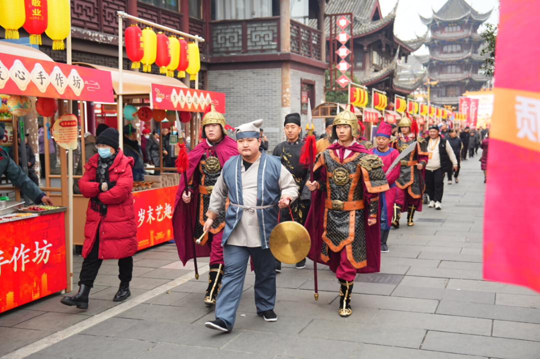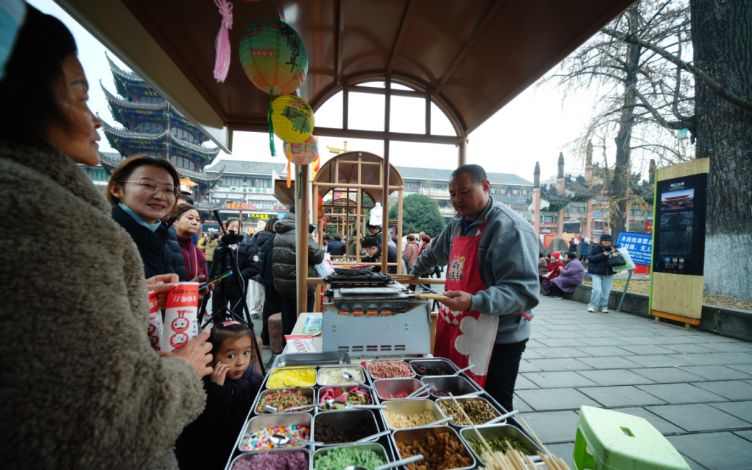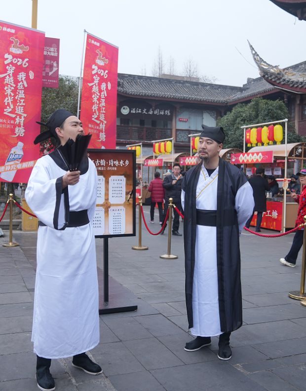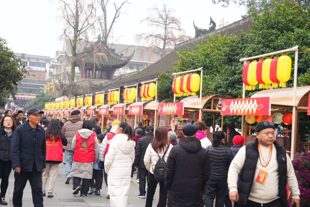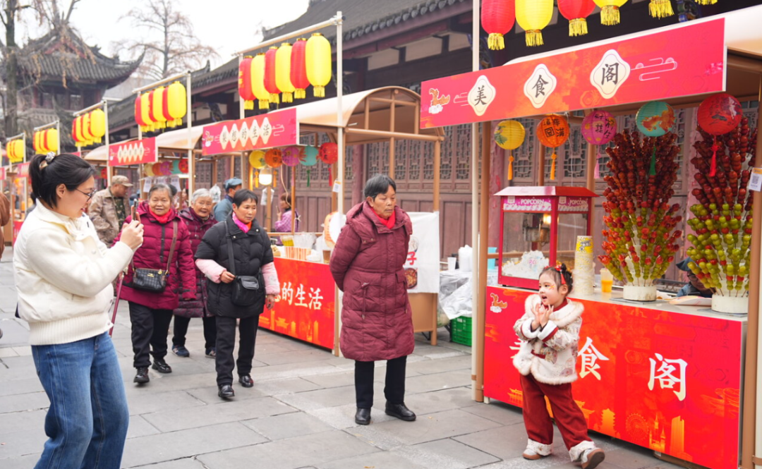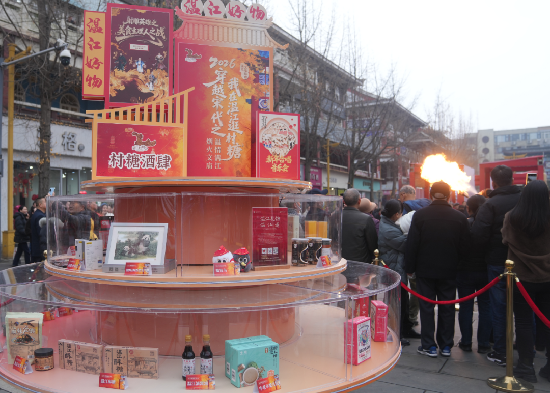 穿过“交子务”,便踏入烟火气十足的“文庙坊市”。30余个宋式摊位以竹木、红灯笼精心搭建,展销着温江滴窝油、寇大香冷吃牛肉、大蒜咖啡、肥儿粉等“温江造”年货好物。