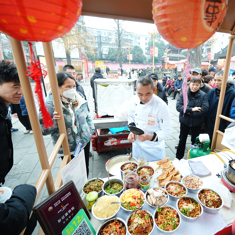 除了可以打包带走的年货,现场还有温江特色美食,其中,彭记蛋烘糕、王鸡肉、韩鸭子、串串糕等摊位前排起了长队,市民游客争相打卡品尝“温江味道”。
