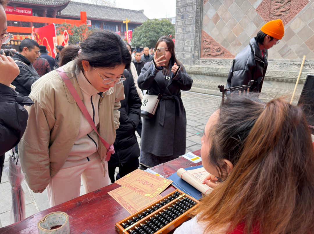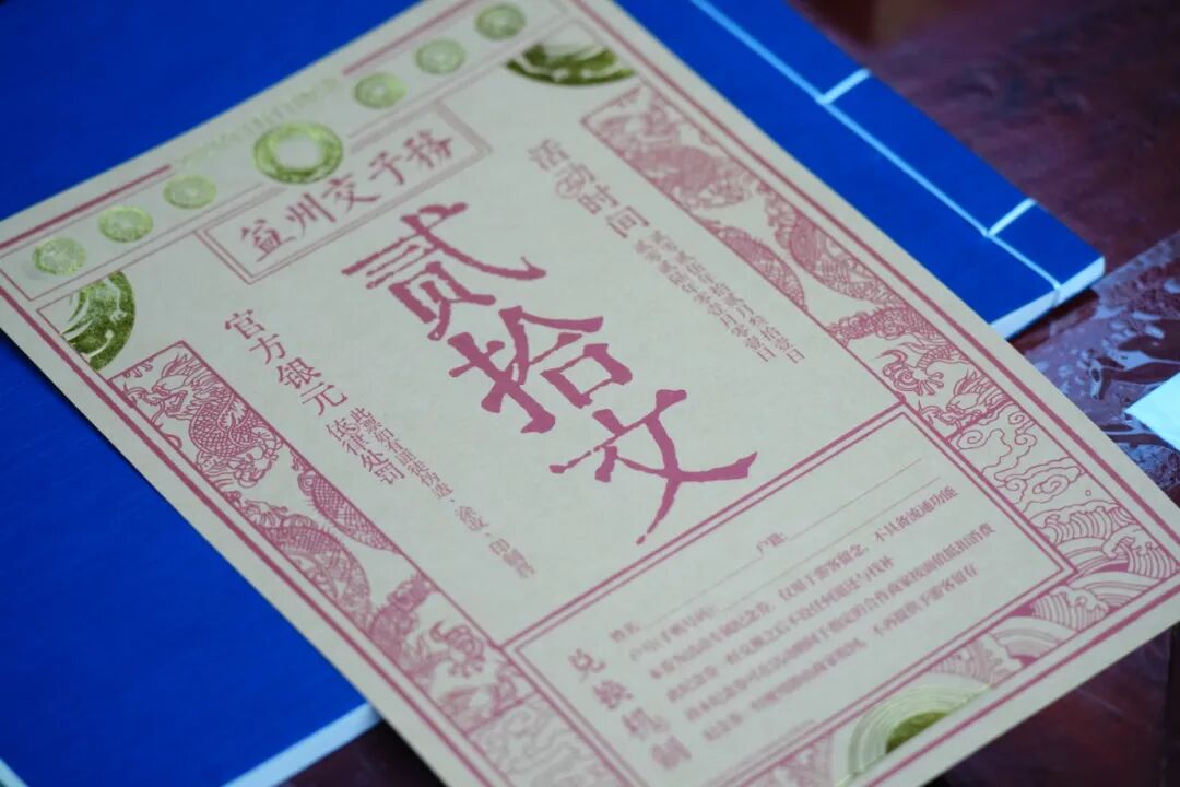 走入文庙广场,一座搭建的3米高宋代官署建筑前人头攒动。这是世界上最早纸币“交子”的发行管理机构象征——“益州交子务”,仿古桌案、账册、印鉴一应俱全。