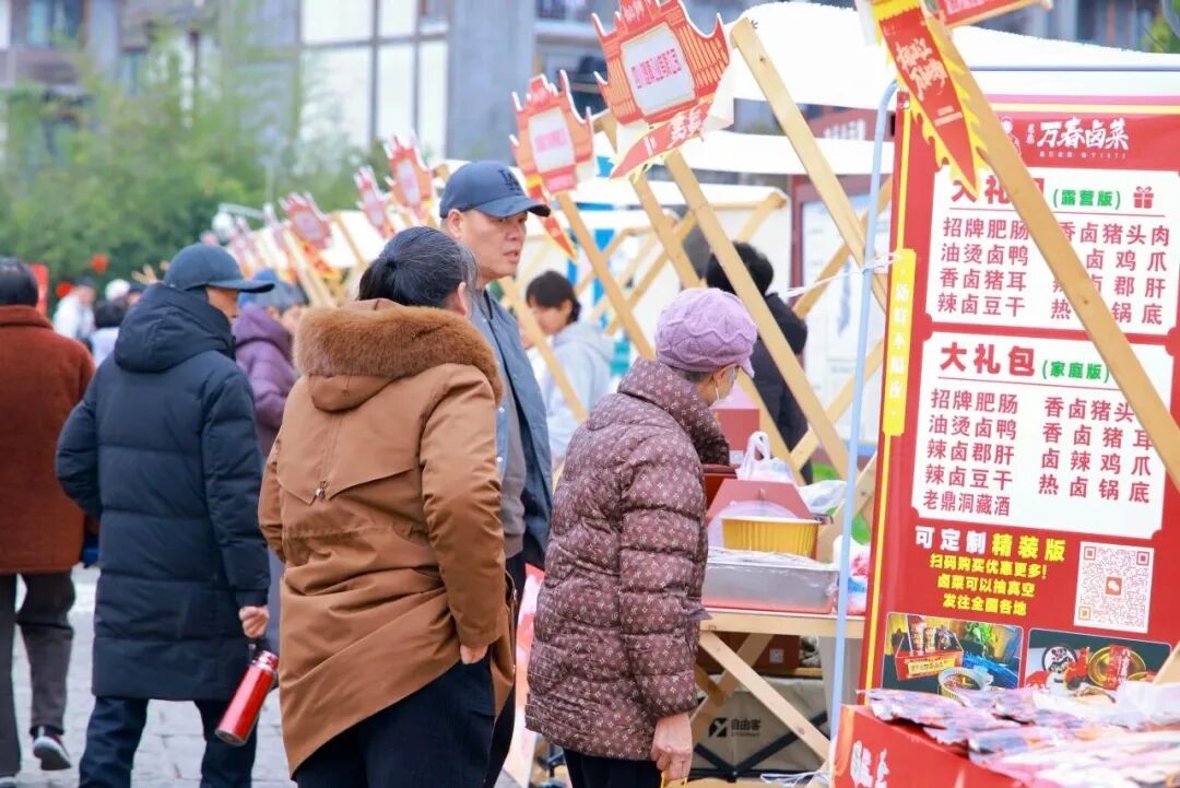 万春非遗卤菜——无需指引,跟随空气中那缕醇厚浓郁的卤香,就能找到万春卤菜的专属体验区。作为源自清代的川式黄卤代表,其百年传承的“老卤”采用草本香料熬制,通过火候自然上色。卤制出的肥肠、猪头肉等菜品色泽鲜亮,甜咸适口。摊位前持续不断的人流,证明了这道经典滋味是温江人年节家宴上不可或缺的硬菜。