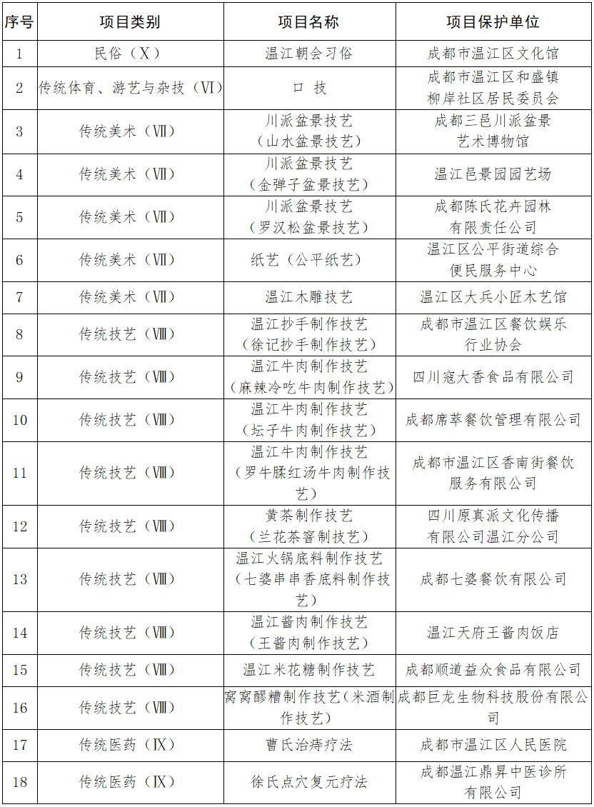 近日,记者从区文广体旅局了解到,温江公布了《第八批区级非物质文化遗产代表性项目名录》,共有18个项目成功入选,涵盖民俗、传统美术、传统技艺、传统医药等多个类别,进一步丰富了温江本土非遗资源库,为传承地域文化注入了新活力。