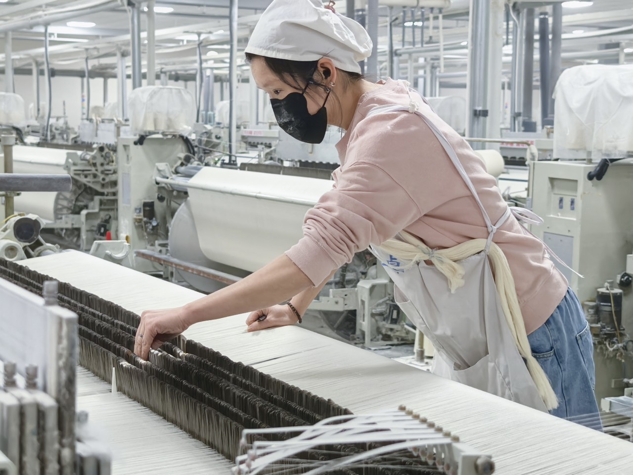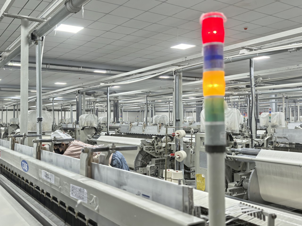 “我们引入国际领先的清梳联、粗细络联设备及高速喷气织机,建成10万锭纺纱规模与224台喷气织机的智能化生产线。”总经理李东升表示,目前生产线上的人工参与度从超过80%降至31%以下,产能提升了1.5倍,如今工厂已经达到一个月100万米布料的产量。
