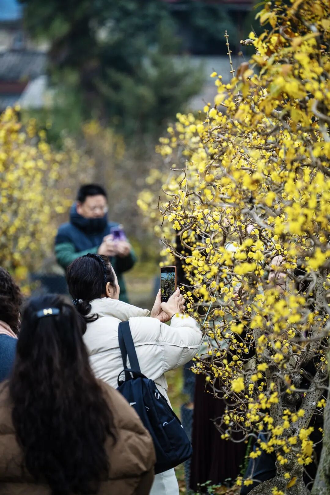 在黄碾梅林,蜡梅盛放的日子里,每天专程来赏花买花的客人络绎不绝。梅林中人潮熙攘,常是一家老小结伴而来,穿梭于花树间流连拍照,再细细挑选几株合意的蜡梅,满载春意而归。