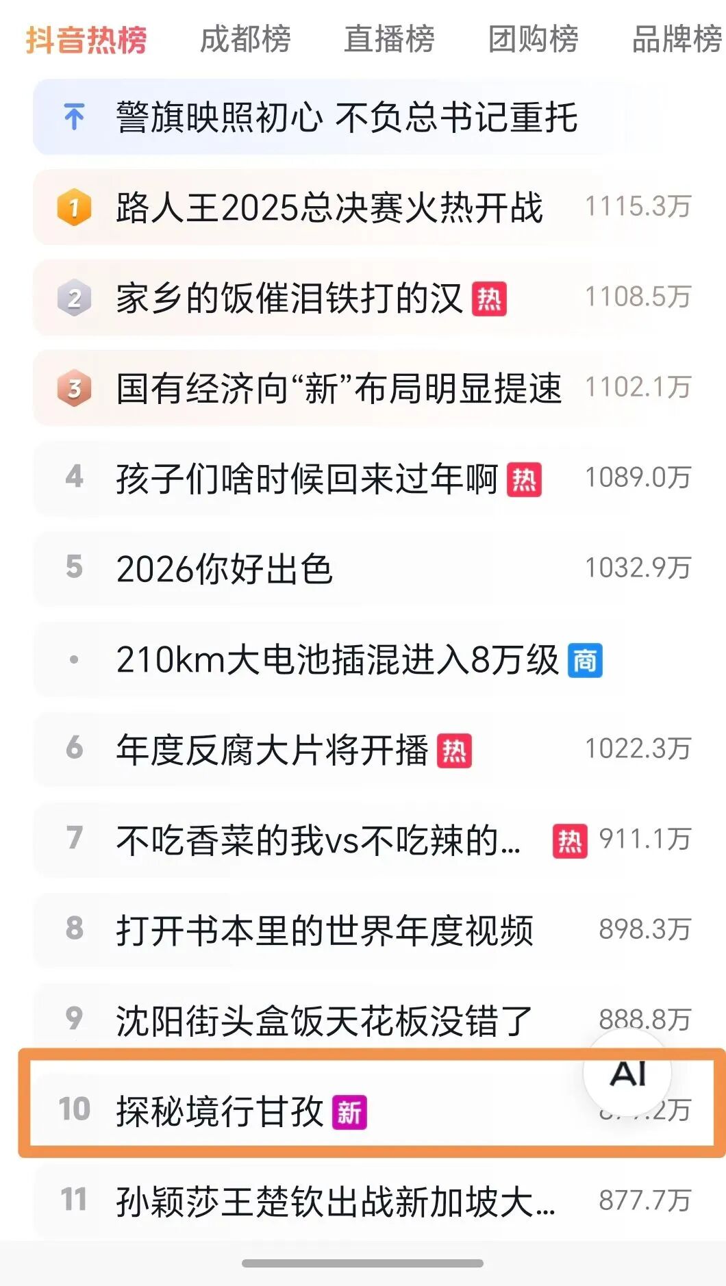 直接冲进抖音热榜总榜TOP10