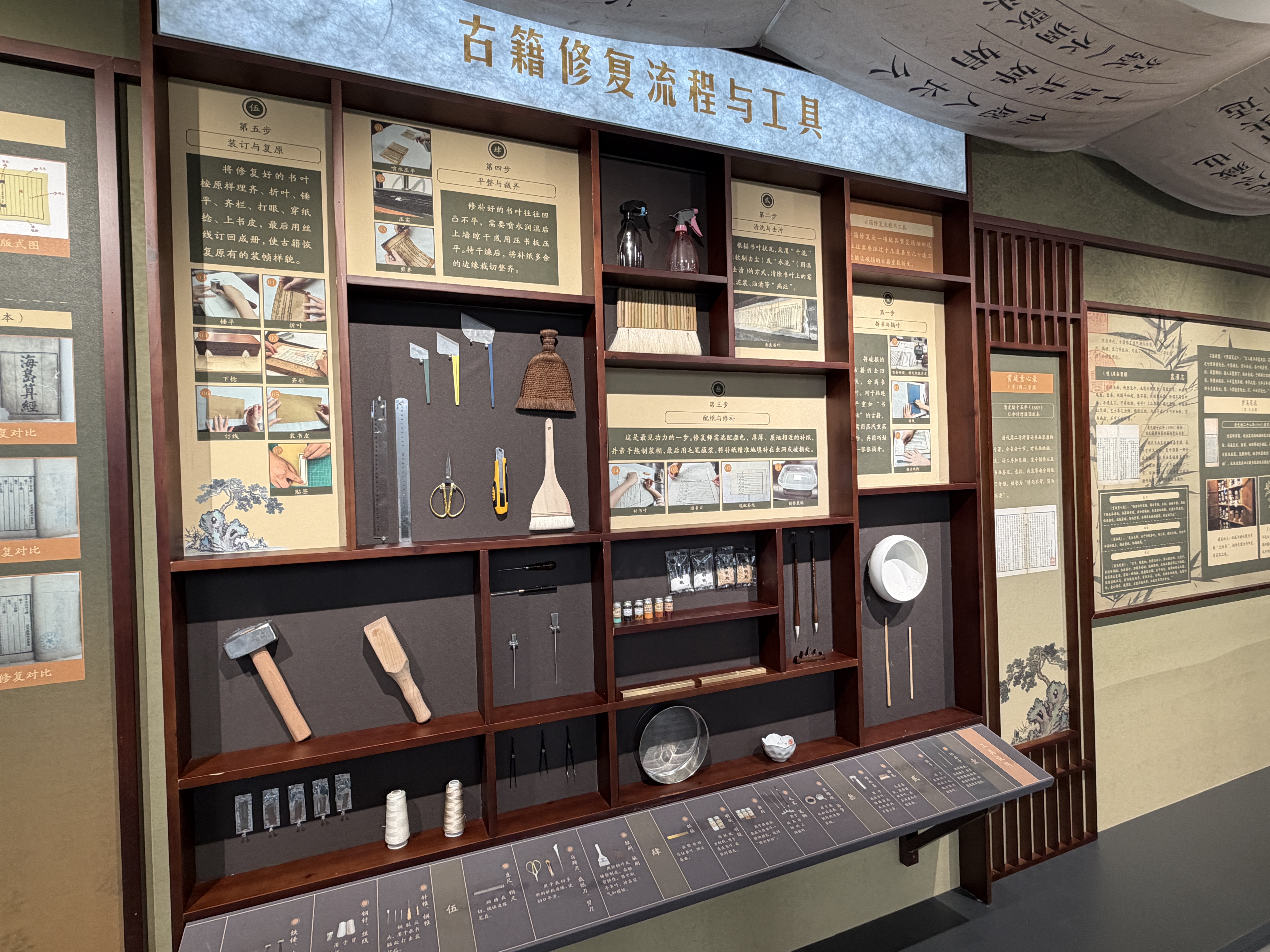 特别的是,展览的“钤印缮珍”单元通过《装潢志》《赏延素心录》等专著,结合拆书、清洗、修补、装订等工序演示,呈现古籍修复前后的对比,直观感受修复技艺的魅力。