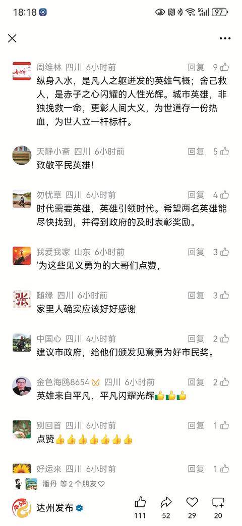 凡人微光,汇成暖流。一次次挺身而出,一个个善意举动,在不断涌现的平凡英雄身上,我们看到了这座城市最动人的底色。达州融媒微信公众号和达州发布微信公众号也分别以《全城寻人!2名跳河救人的勇士,你们在哪?》《扩散!达州全城寻人!》为题报道了此事,引发众多市民点赞关注。大家纷纷在评论区留言:“人间有爱,英雄无名,真英雄!”“纵身一跃,方显男儿本色;默默转身,尽现仁者初心。冰冷的河水挡不住热心,你的举动,温暖了一个家庭,也温暖了一座城。”“人间友爱,向救人无名英雄致敬。”……