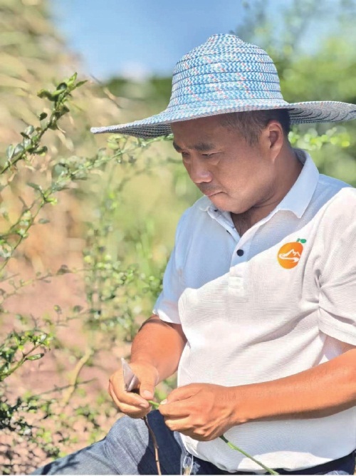 2025年3月,李顺心在育种园里,剪下新品种柑桔,用于鉴定。 受访者供图