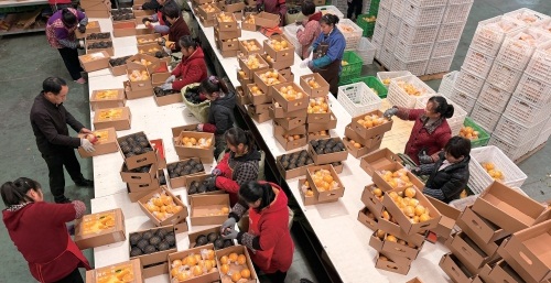 2025年12月,四川省眉山市艾乐种植基地里,工人正在打包李顺心他们卖出的柑桔。 受访者供图