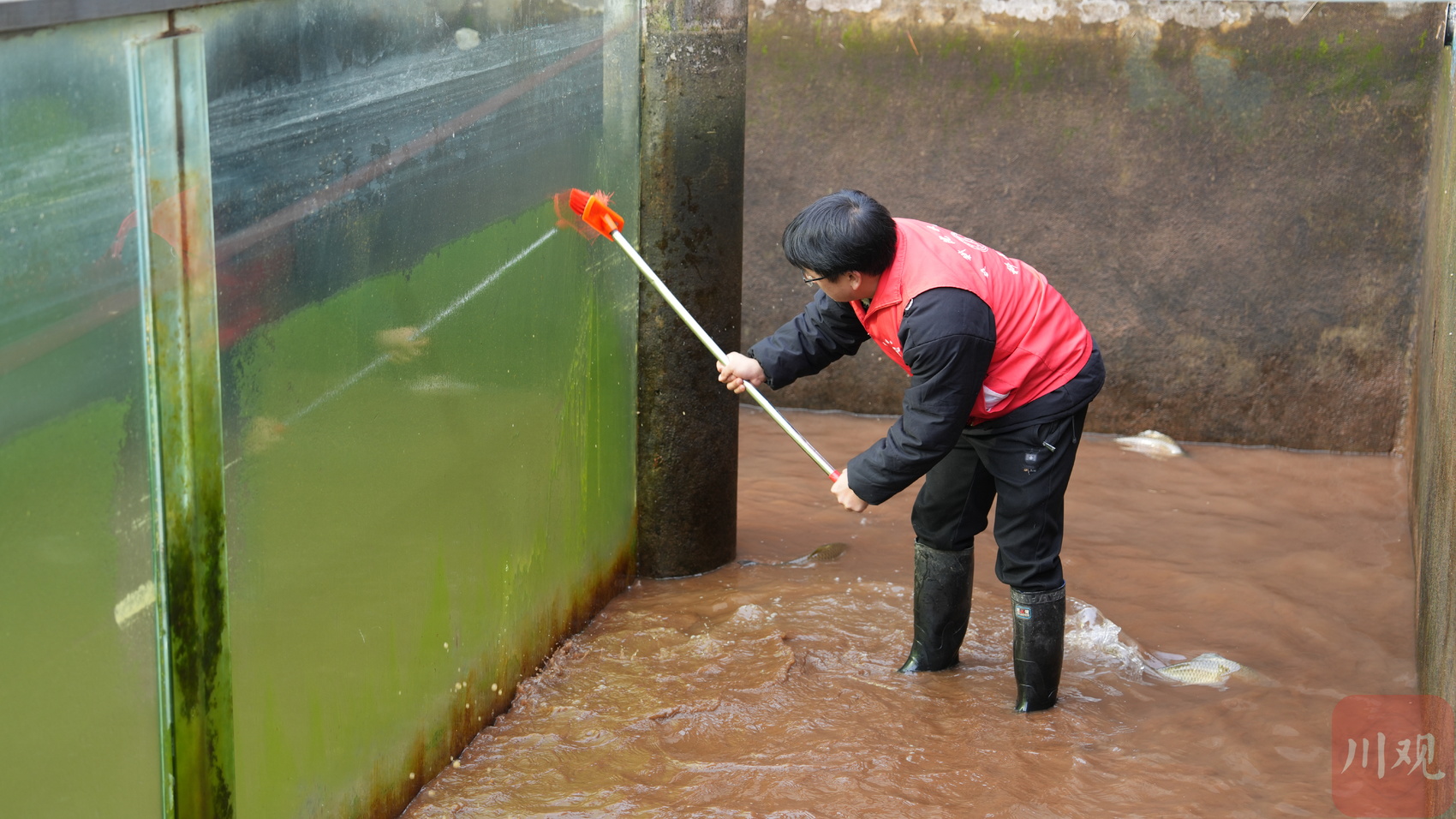 孔秋宏正在清理鱼池。