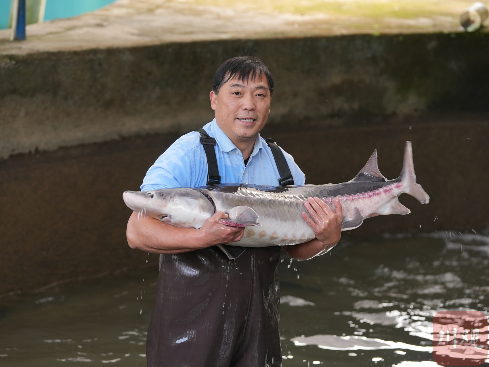 冬日的阳光是骗人的,站在研究所的池边,能感到水汽里的寒意。但为了搞清一条待产“孕妈妈”的状况,周亮二话不说,穿着下水裤就踏进了冰冷刺骨的水中。几十斤重的长江鲟尾巴一摆,冰水瞬间泼湿了他胸前的衬衣,紧贴在皮肤上。他的动作没有丝毫迟疑,眼神里反而溢满了专注与温柔。