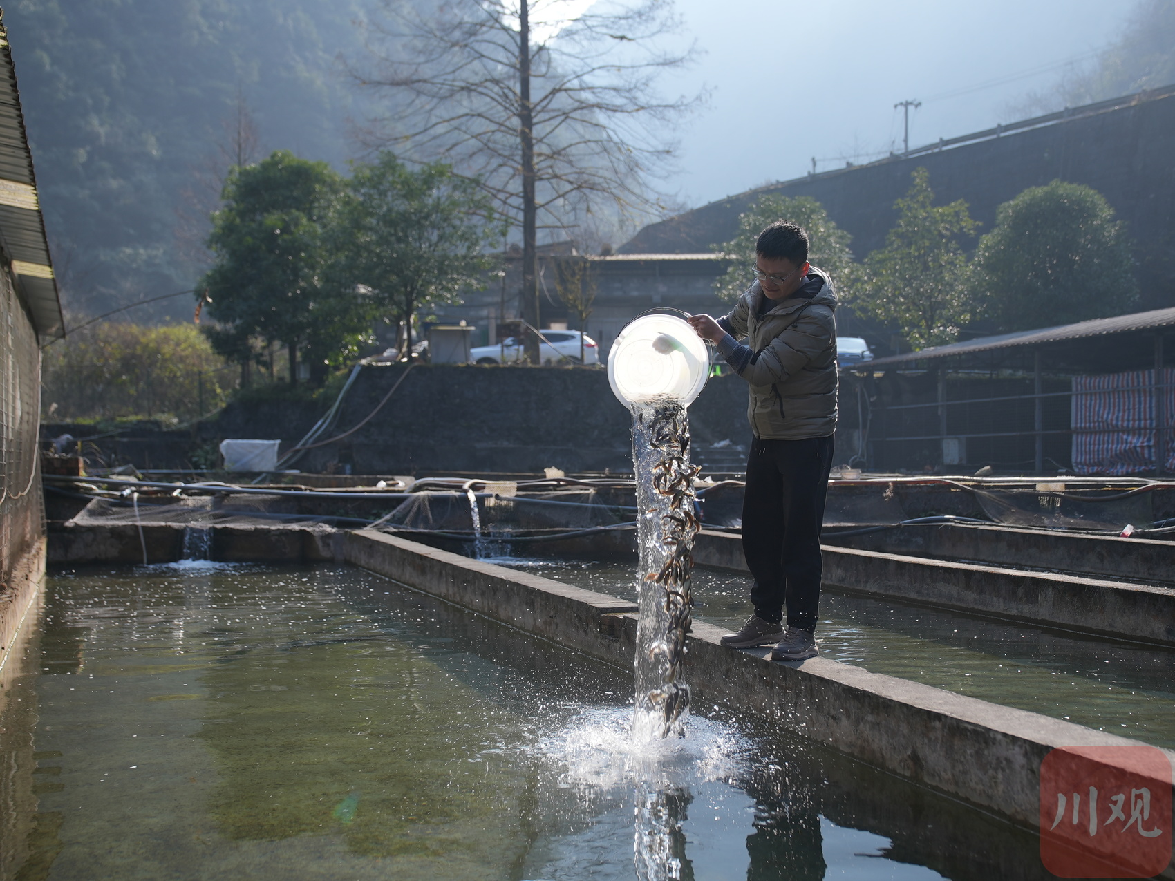 科研人员为川陕哲罗鲑喂食。