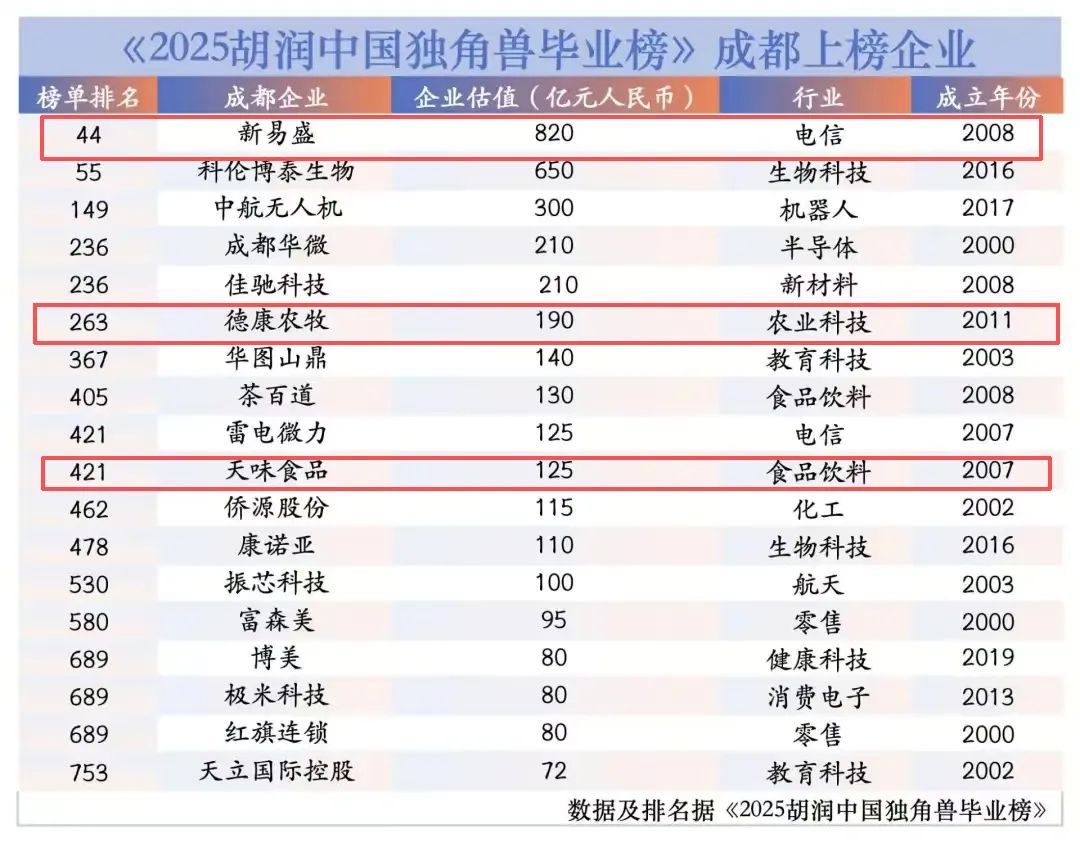 全国共有796家企业上榜,成都共有18家企业跻身《2025胡润中国独角兽毕业榜》——分别是企业价值排名44位的新易盛,55位的科伦博泰生物,149位的中航无人机,并列236位的成都华微、佳驰科技,263位的德康农牧,367位的华图山鼎,405位的茶百道,并列421位的雷电微力、天味食品,462位的侨源股份,478位的康诺亚,530位的振芯科技,580位的富森美,并列689位的博美、极米科技、红旗连锁,753位的天立国际控股。