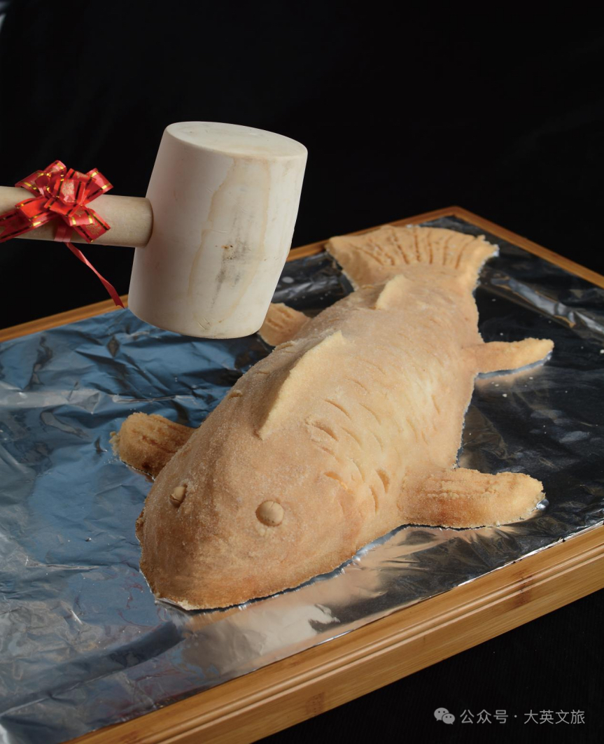 烤制环节严格遵循古法工艺,对火候与时间把控精准到极致,践行“低温慢烘、文火出香”的准则。将裹好盐泥的鱼放入提前预热至160-180℃的烤箱,恒温烤制40分钟左右,期间无需翻动,让非遗古盐的咸香缓慢渗透,同时使鱼肚内馅料风味与鱼肉本味深度融合。随着烤制推进,洁白盐泥渐染金黄、质地坚硬,鱼皮也在盐壳包裹下形成一层薄脆酥香的“黄金甲”。这种做法以千年古盐唤醒鱼之本味,以精准火工铸就酥嫩口感,不过度依赖调料,主打咸鲜香本味,既延续古法盐藏智慧,更是裸烹艺术的极致体现,食客能清晰尝到鱼肉自身的清甜与油脂香。