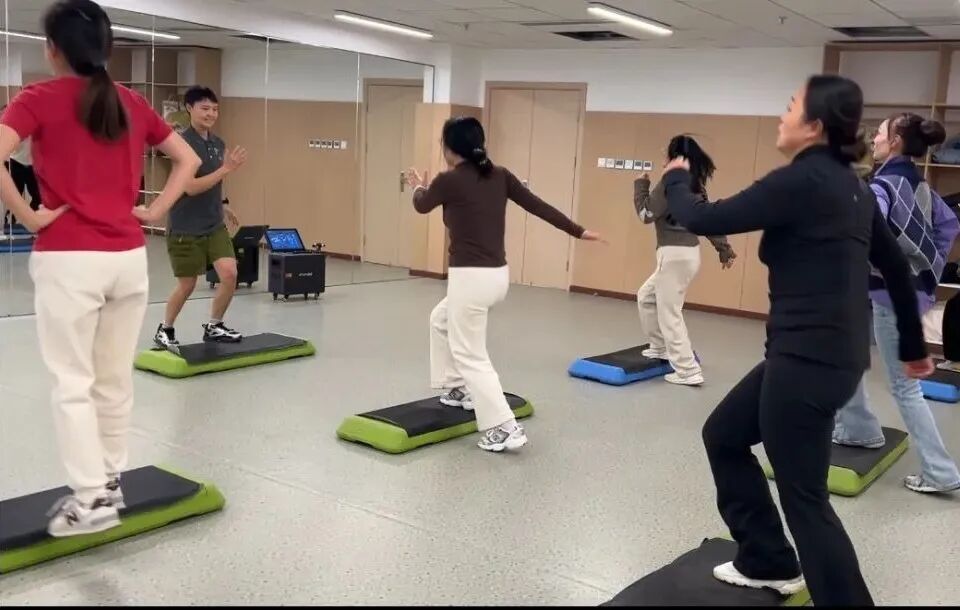 居民正跟着教练健身锻炼