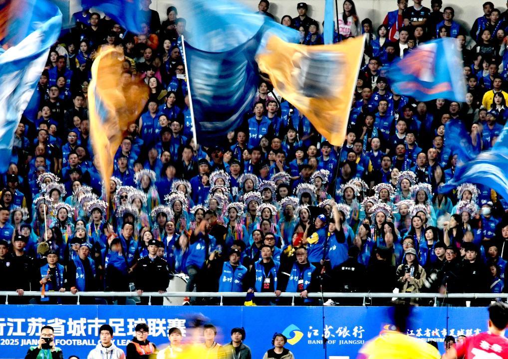 ↑2025年11月1日,在南京奥体中心举行的“苏超”决赛上,泰州队球迷为球队加油助威。图据新华社