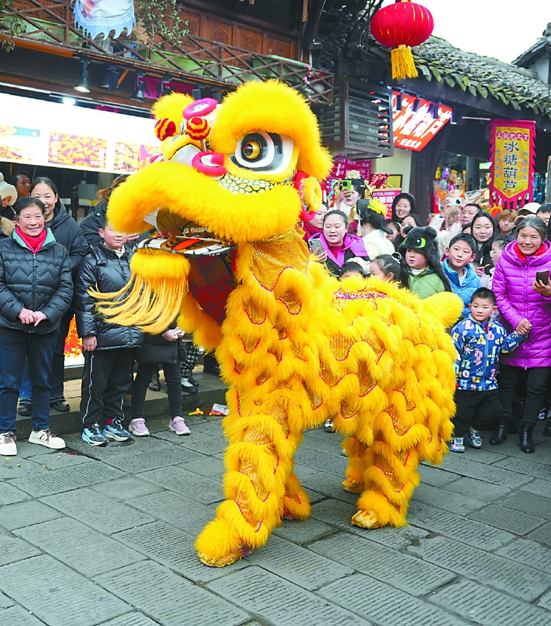 阆中古城街头精彩的舞狮表演。