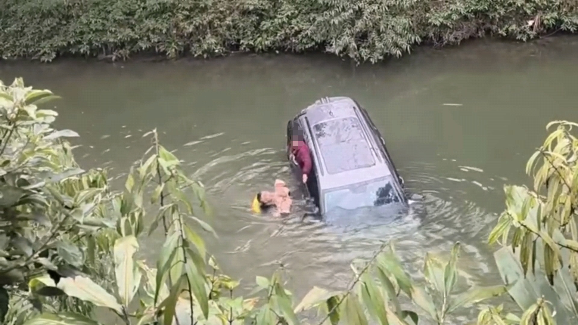 抵达现场后,李久富发现,坠河轿车居于河中央,车头朝下已被淹没,车尾上翘,车身正以肉眼可见的速度缓慢下沉。河水透过车窗缝隙灌入车内,即将漫过后排座椅,车内传来被困者焦急的呼救声。