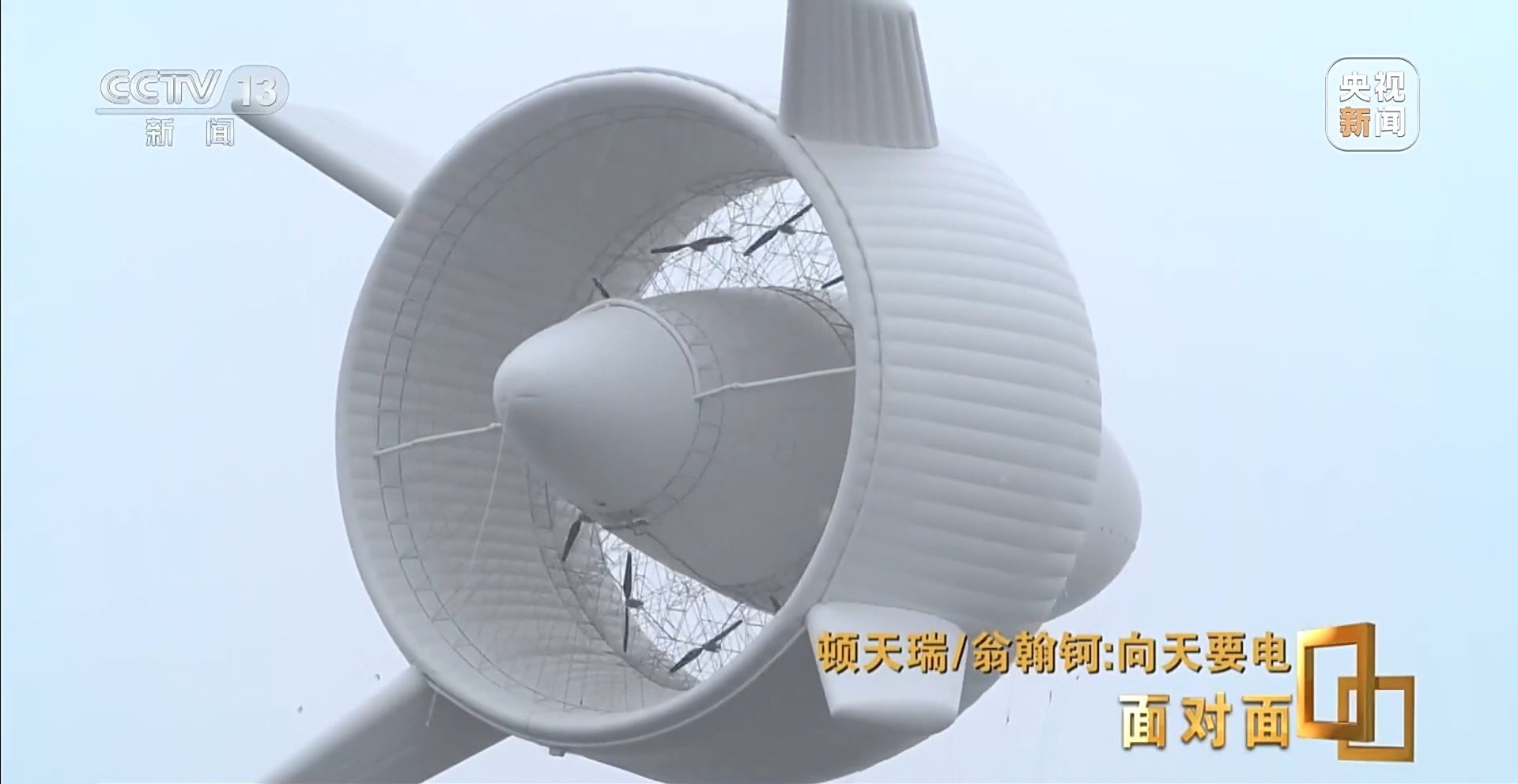 顿天瑞:每个黑色叶片相当于是一个风力发电机的叶片,风过来的时候推动每一片叶片转动,就产生了电能。这和地面上风机原理上没有任何区别,但是在天空中它巧妙的地方就在于有12组机组。这一个位置实际上装了三台100千瓦扁平的盘状电机,总共加起来这一圈实际上最满达到3.6兆瓦级别这样一个电力。