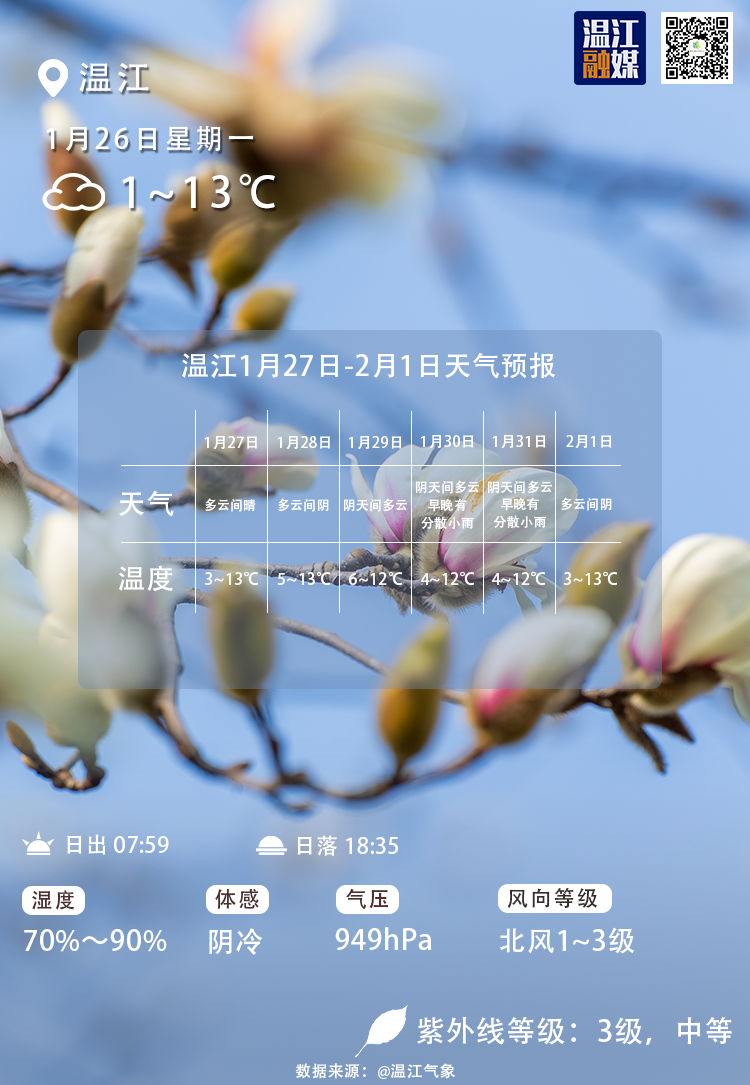 1月31日(周六)阴天间多云,早晚有分散小雨,气温4~12℃;
