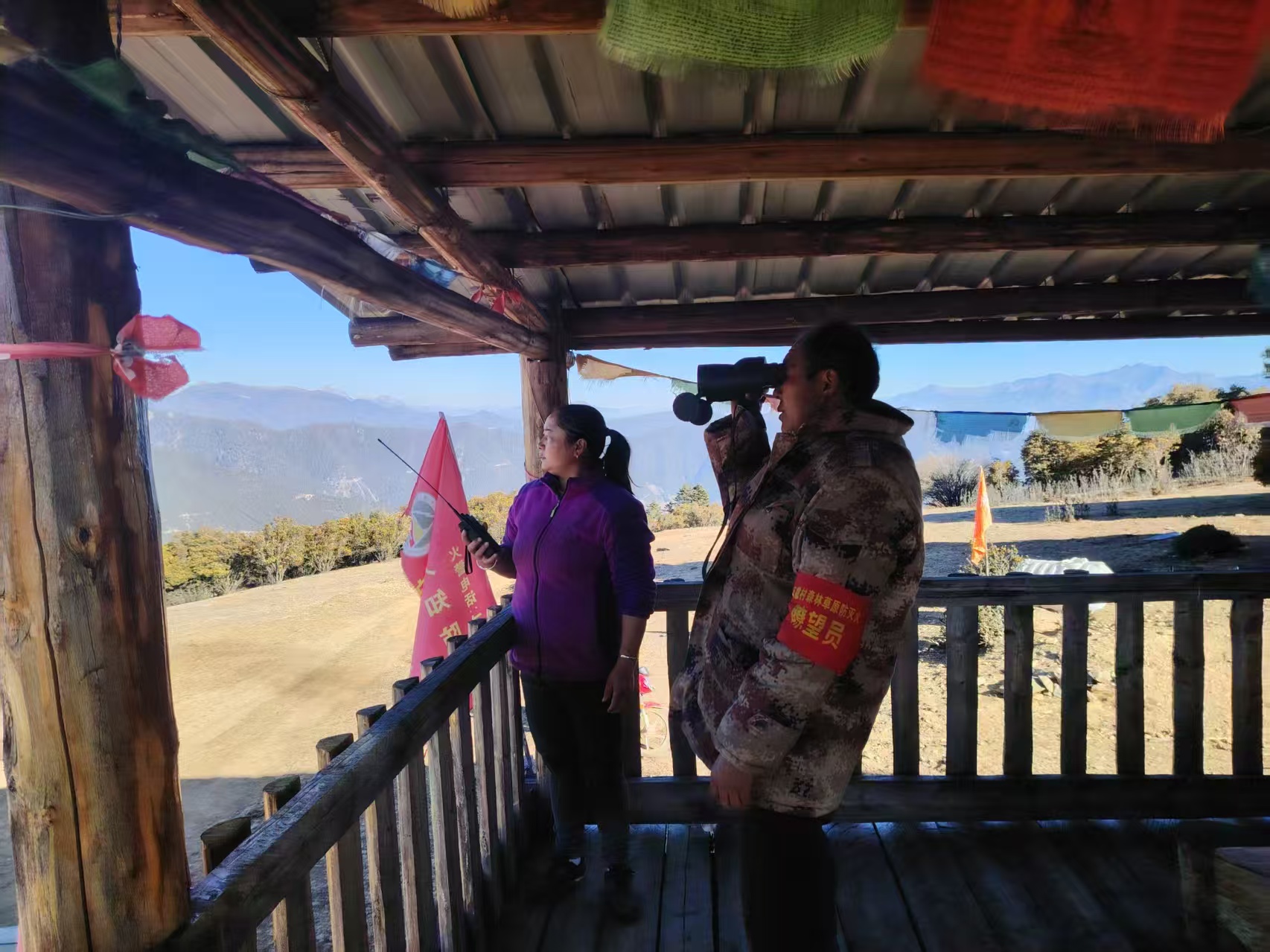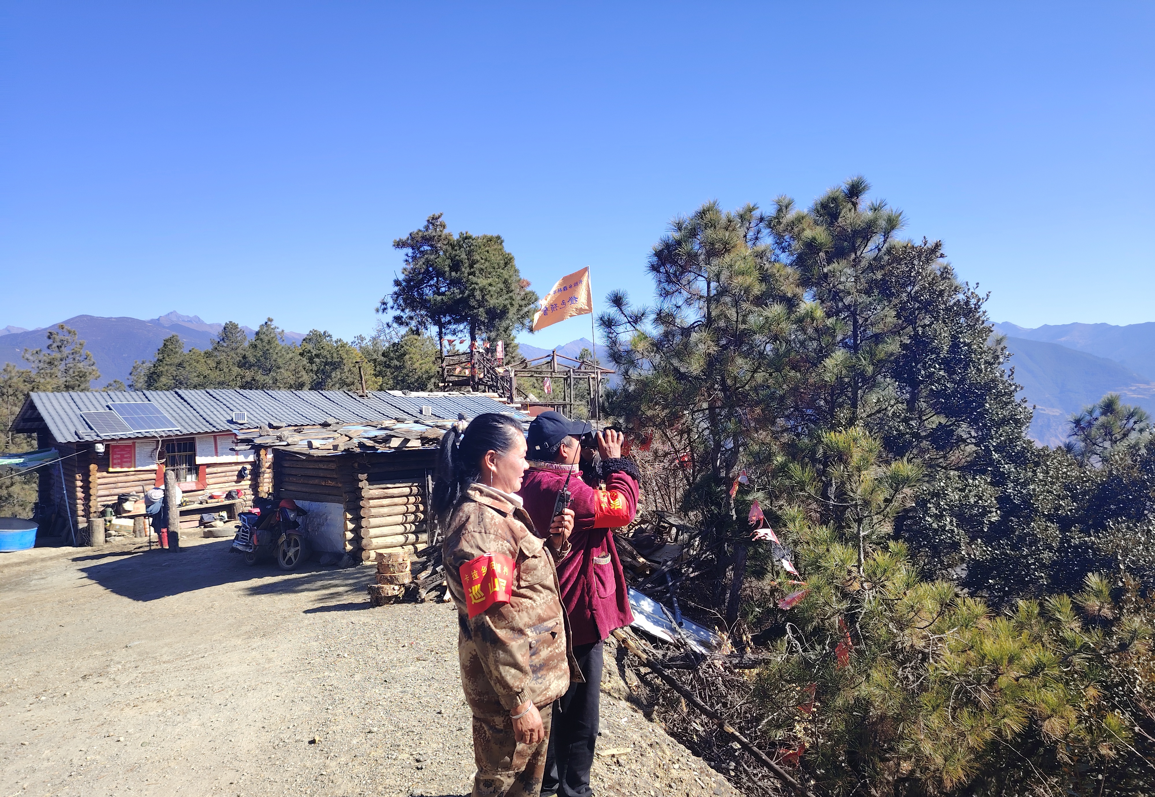 每日天刚蒙蒙亮,英宝祝玛便要用望远镜巡查山林情况,不时通过对讲机向乡里报平安;降冲次尔除承担瞭望任务外,每日还要踏上蜿蜒的山路巡山。他挎着装满酥油茶的保温壶,揣着几块麦面馍和牦牛肉干,穿梭在林海间。林区的每一道山梁、每一条山沟、每一片林地,乃至林木种类、水源位置、水池分布,都深深印刻在夫妻俩心中。遇到森林草原防灭火红色预警时,二人便整夜值守,寸步不离守护这片林海。
