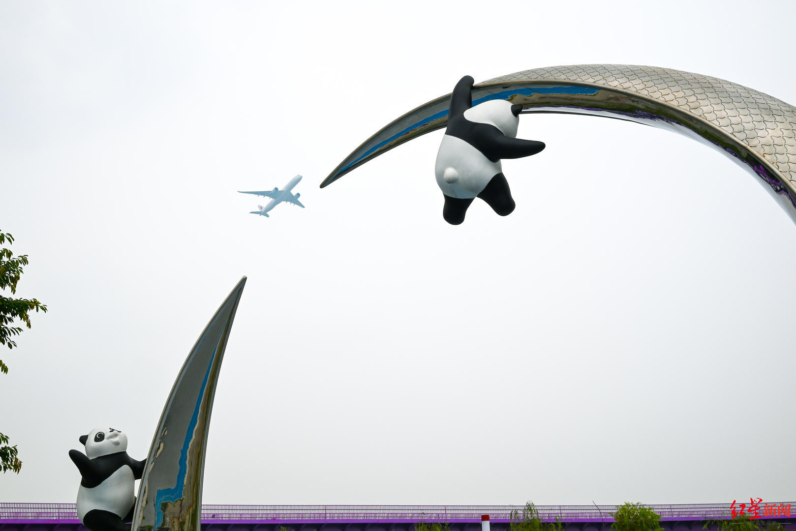 ▲园区的熊猫雕塑和双流机场起飞的飞机相映成趣 摄影:王勤