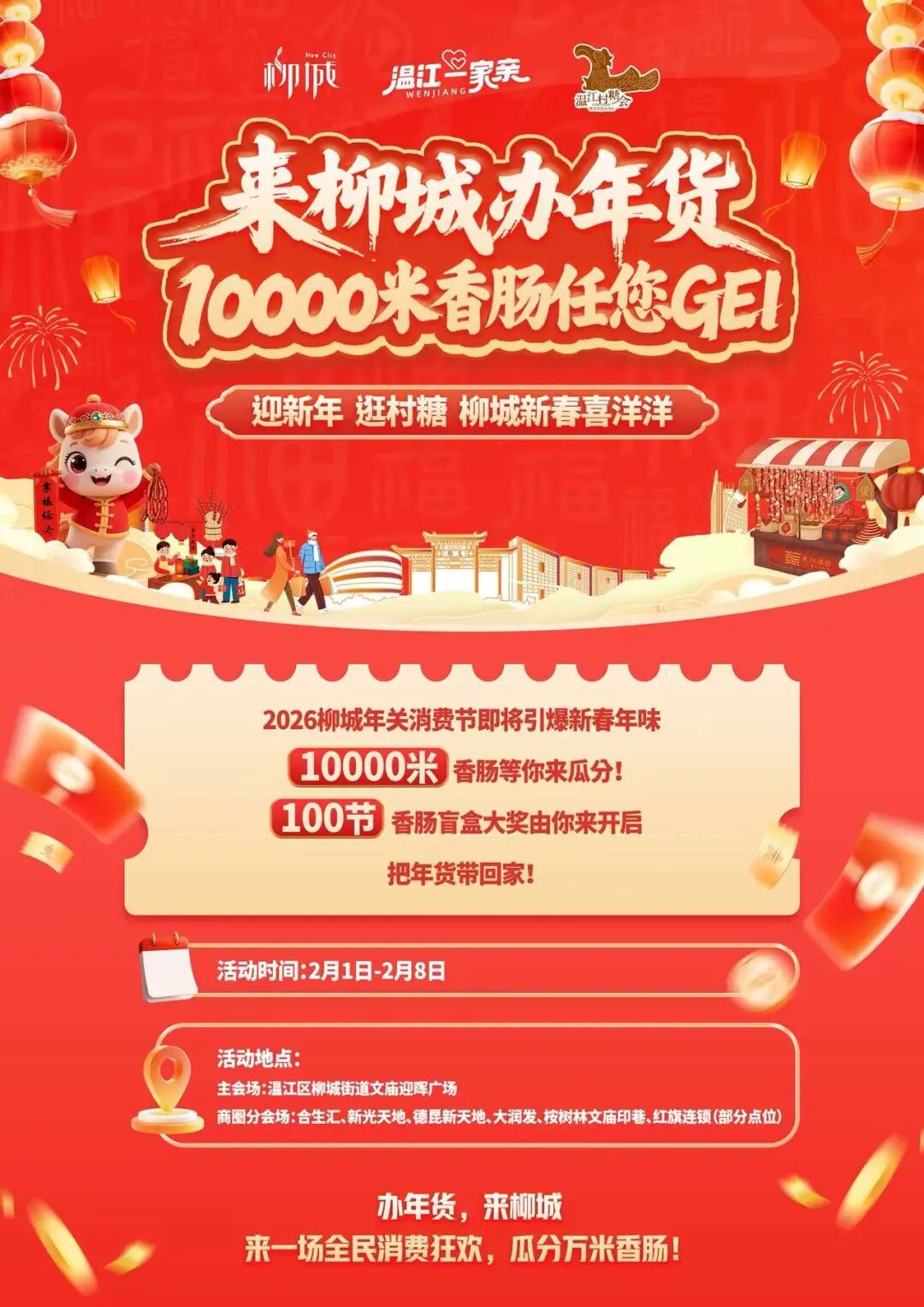 以最具年味的香肠为主线,串联吃、住、行、游、购、娱全业态,活动期间在柳城商圈单次消费满两百元,即可获得“瓜分万米香肠”资格。