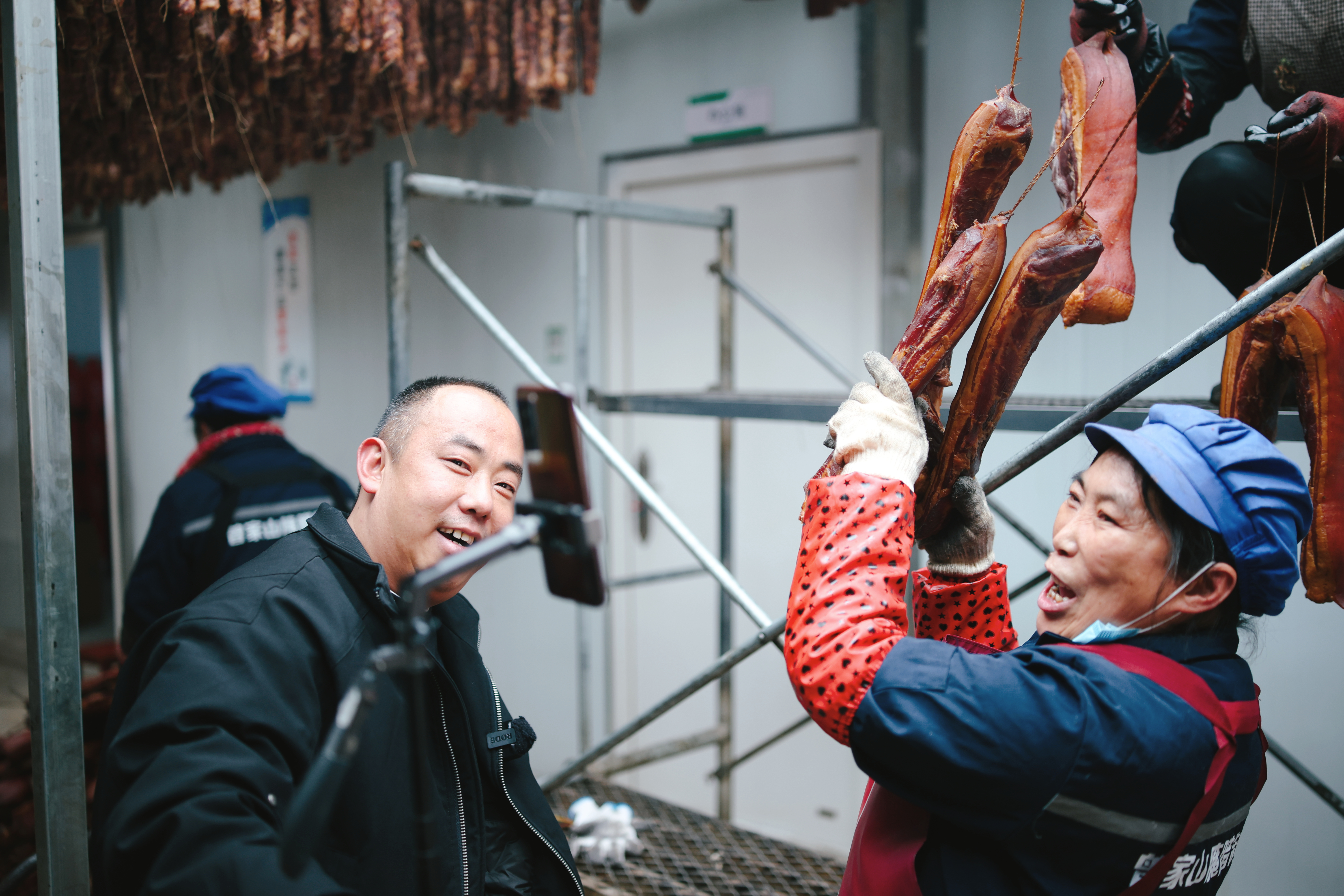 腊味,“寄”走了异乡人的“乡愁”,“寄”来了当地人的“机遇”。特别是每年冬天腊味生产的旺季,农场需要工人来处理食材、腌制、晾晒、包装,这些岗位让不少村民在家门口就能挣到钱。工人严大秀说:“家门口就可以就业,每月可以收入4000元。”