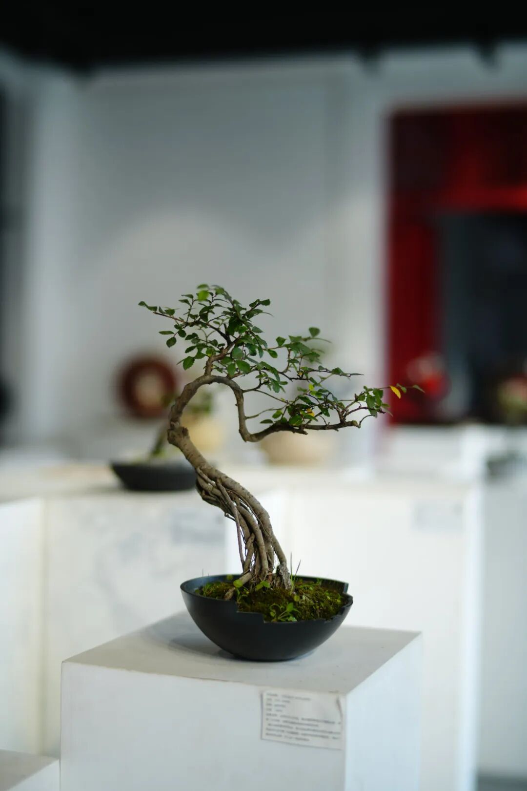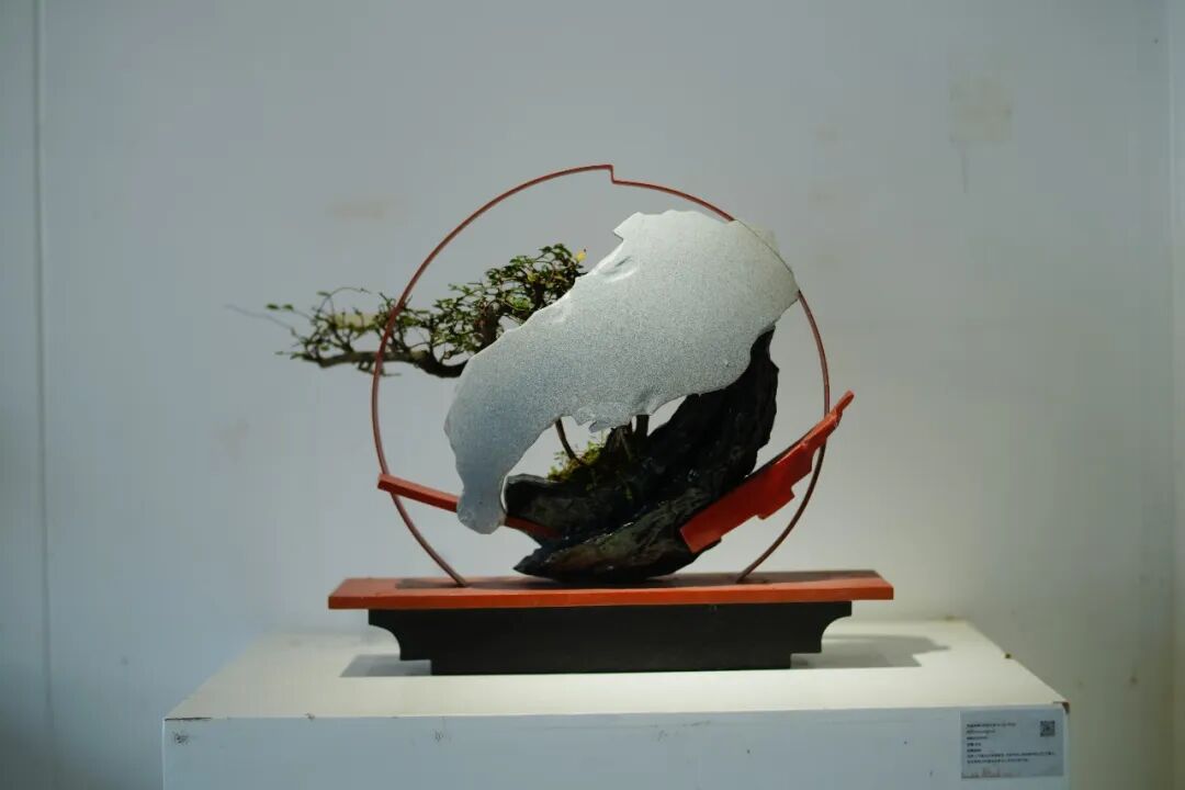 “这件作品的创意源自白居易笔下‘犹抱琵琶半遮面’的诗句,是东方意象表达与写意雕塑的巧妙结合,将传统东方文化的哲学性碰撞与融合展现得淋漓尽致。盆景正面树枝旁逸斜出,尽显含蓄之美,背面的枝干则从老桩间探出头来,洋溢着蓬勃生机,枝叶疏密有致,在虚实之间漾开东方美学的涟漪,让人沉醉其中。”