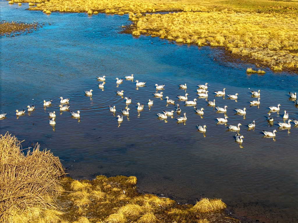 这份生机并非邛海独有。在布拖县,乐安这片高原沼泽泥炭湿地,曾因人为开垦而严重萎缩。如今,随着保护力度加大,乐安湿地现有野生鸟类30余种,其中国家一级重点保护鸟类3种、数量达100余只,黑鹳从监测初期的6只增加到现在的28只,黑颈鹤由原来的10余只增加到现在的70余只,东方白鹳由2022年的1只增加到4只;国家二级重点保护鸟类灰鹤上百只,普通秋沙鸭、灰雁等数量也在持续增多。每年冬日,黑颈鹤、灰鹤等上万只珍稀候鸟如约而至,在雪境中翩跹,构成一幅美丽的生态画卷。