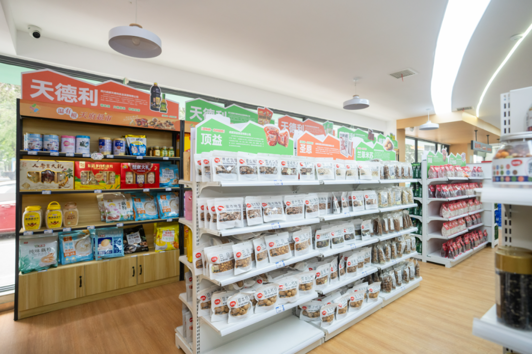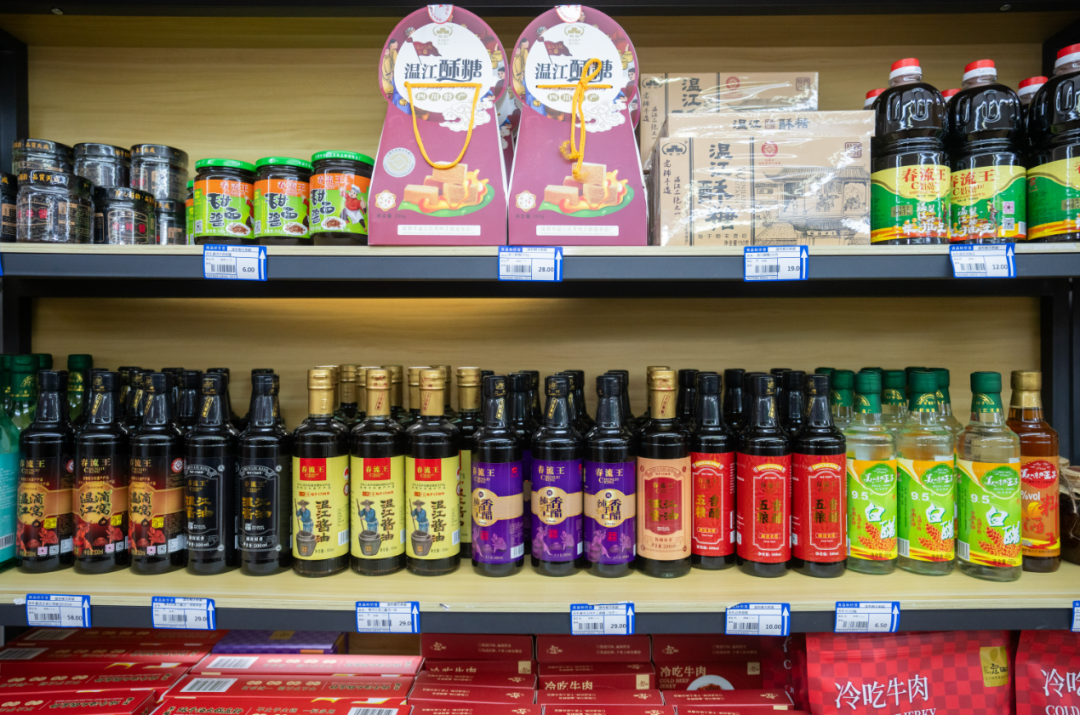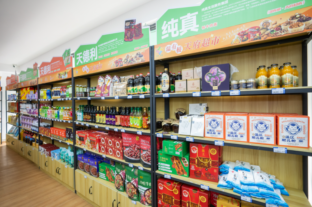 据了解,这个面积近300平方米的超市,不仅提供娃哈哈、康师傅、香飘飘、五芳斋、蜜缘枣业、寇大香等绿色食品,还可以买到温江肥儿粉、高山村的黑蒜、温江滴窝酱油等特色农特产品,全方位覆盖居民生活所需。